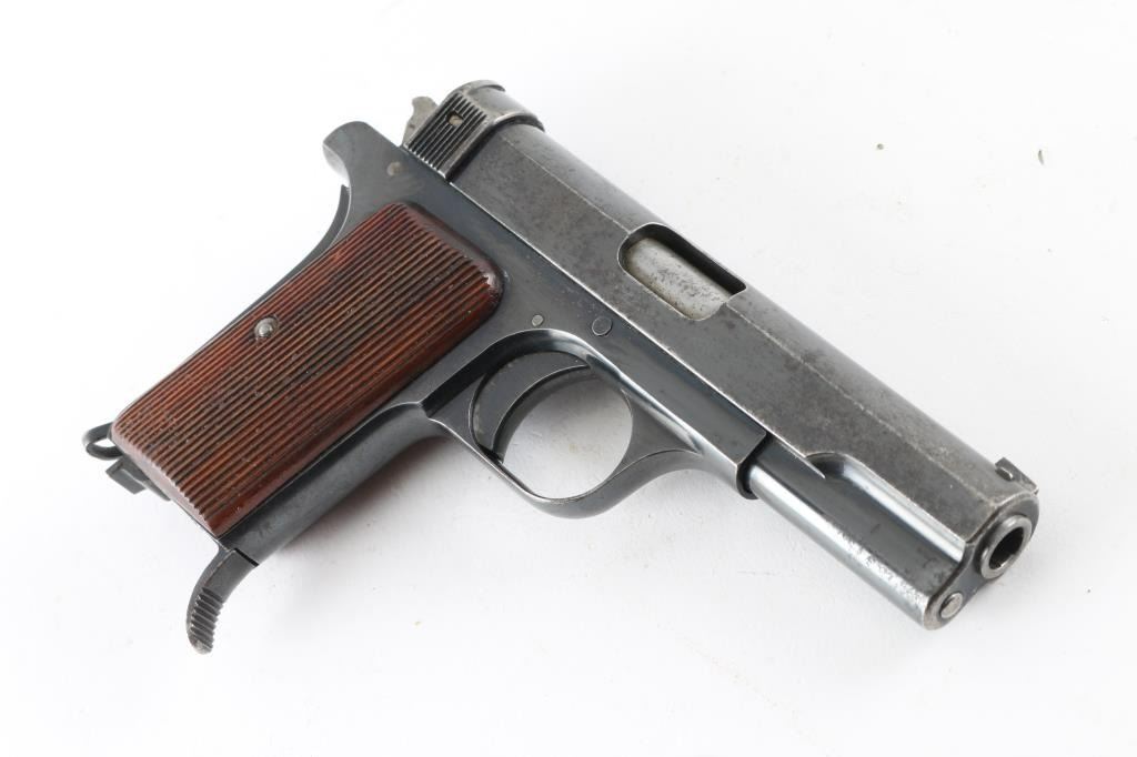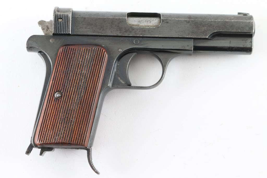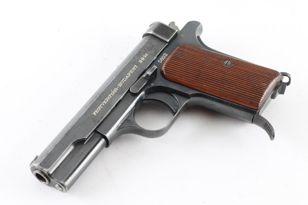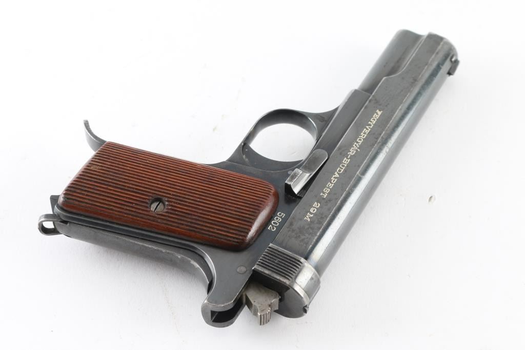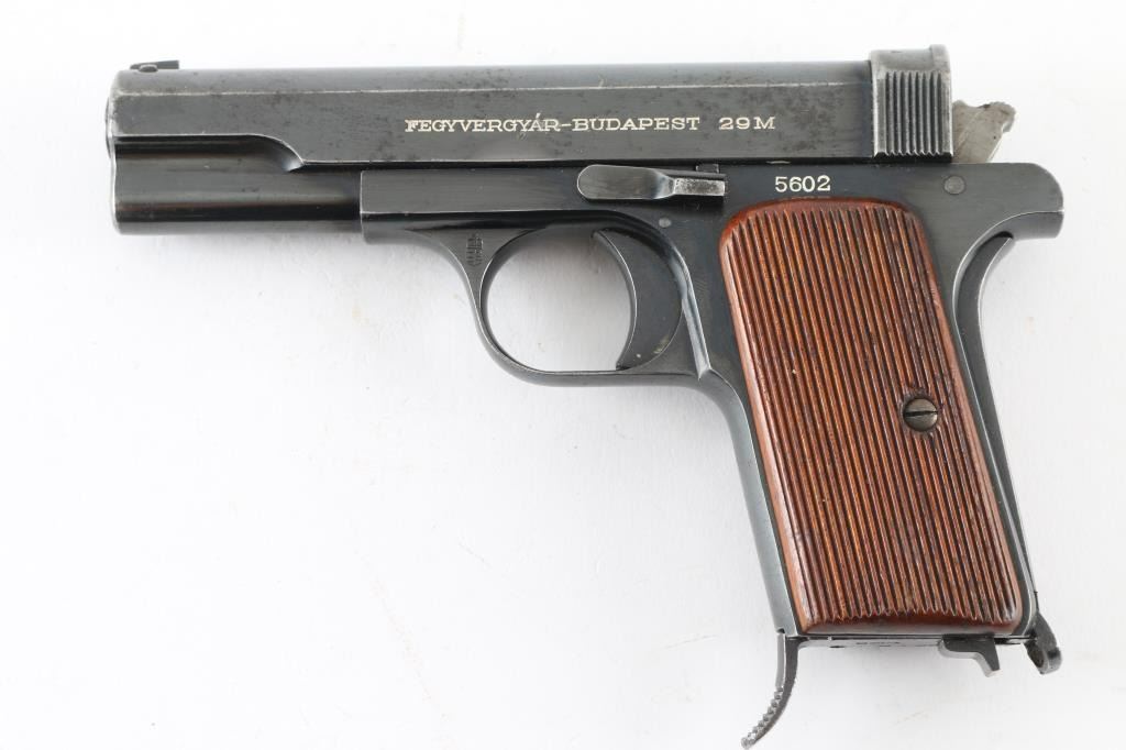Hungarian military semiautomatic pistol, designed by Frommer, manufactured circa early 1930's. Features blued finish, grooved wood grips, 3.9" barrel, fixed notch rear and dovetailed blade front sights, heel magazine release, lanyard ring, exposed hammer, single action trigger, gip safety. Bore is good condition with light frosting throughout and some pitting near muzzle, overall fairly bright with strong rifling. Retains 70% dark bluing with edge losses, scattered patina throughout (especially on right side of slide). Magazine is very good condition, holds 7 rounds, has large pinky rest extension, marked "29M" on base. Grips are overall very good. Markings are crisp, with no importer marks observed. Less common precursor to the later model 37, with estimated 50,000 units made.. Condition is near NRA Very Good *** C&R Firearm ***