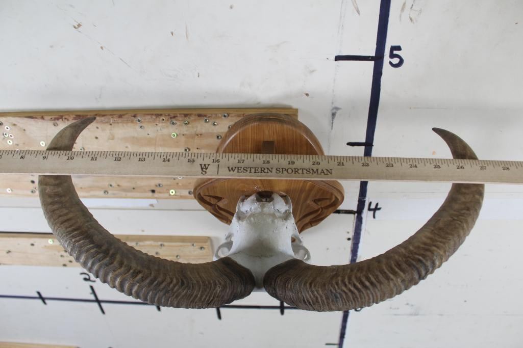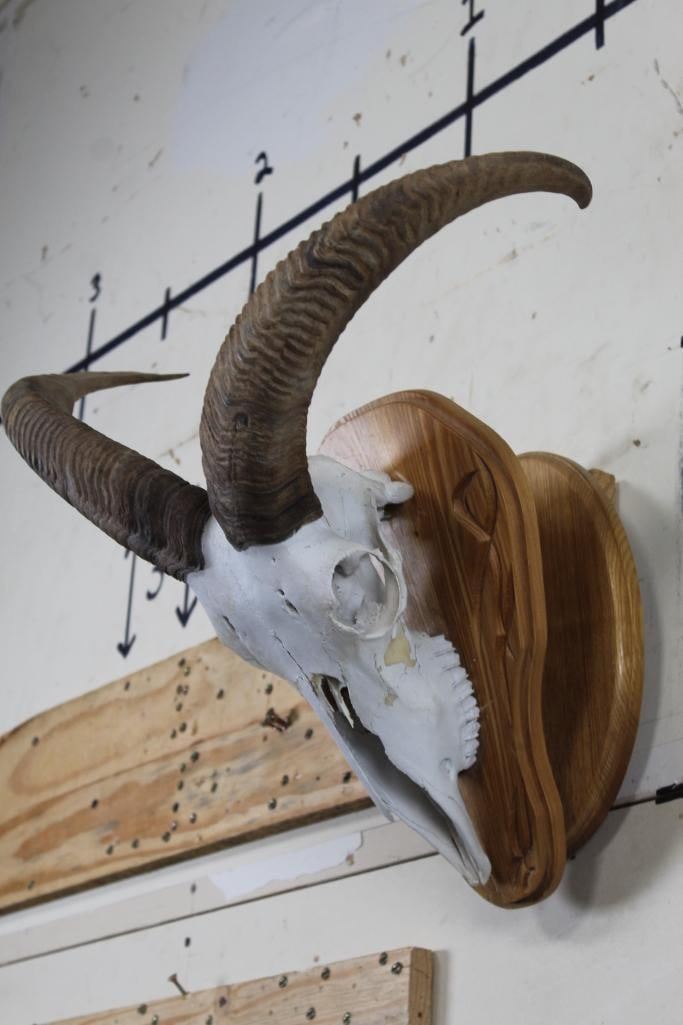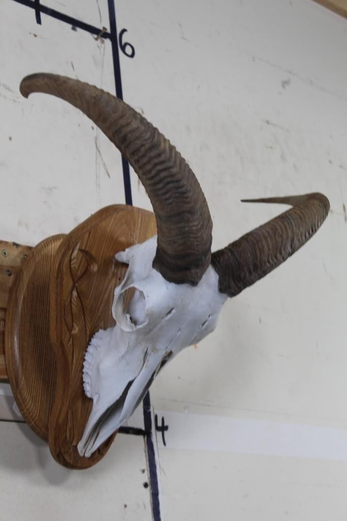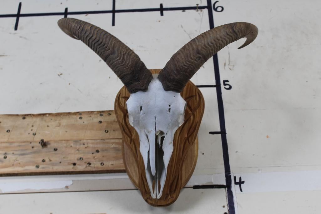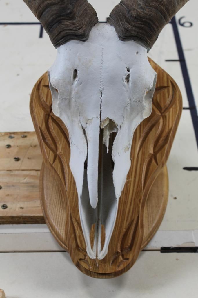 This Female AOUDAD Skull is painted and has ALL its Teeth. It is missing a nasal bone. Mounted on a Wooden Plaque Wall Pedestal. TAXIDERMY