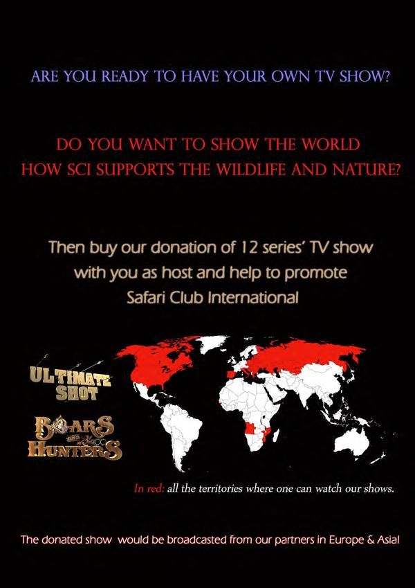 Safari Season Ltd. has donated a Filming of 12, 22-Minute Episodes for a Hunting TV Show. Put your hunts of a lifetime on film! This is the same team which makes the 'Ultimate Shot' - Archie Nesbitt's TV show - sold in Europe and Russia! Included: Filming of 12, 22-minute episodes; a special edition of the final product for the hunter on DVD and BD; cameraperson for 80 days (days for transport/transfer are not included in this number); high definition video equipment; advanced cut editing (plus color correction, image stabilization) of the footage; FX video and precomposed motion graphics; 3D objects and effects; opening/teaser; music; script writing; English narration talent; and distribution rights for the USA and Canada. Not included: Camera person's transportation to and from the place for filming; all air tickets, transfers, etc. for the camera person; meals and accomodation of the camera person; and any observer rates. Important to the hunter: TV show must be filmed in no more than 18 months and ready for release 6 months after that. Additional rates (for over initial 80 days): Videographer - $ 450 for a full day + mileage & expenses; advanced cut editing -$4.50/minute raw footage; color correction - $1.50/minute ready footage; image stabilization - $2.50/minute raw footage; FX Video and pre-composed motion graphics (2xtitles, 2xmaps, 2xlower third) - $400; music track stock music: $15 per track; audio mixing sound effect - $5/minute: DVD or BD authoring and artwork (1 project) - $100. For more information, contact Sani at Int. 35 989 981 2591 or info@safariseason.com. Company's website: www.safariseason.com.