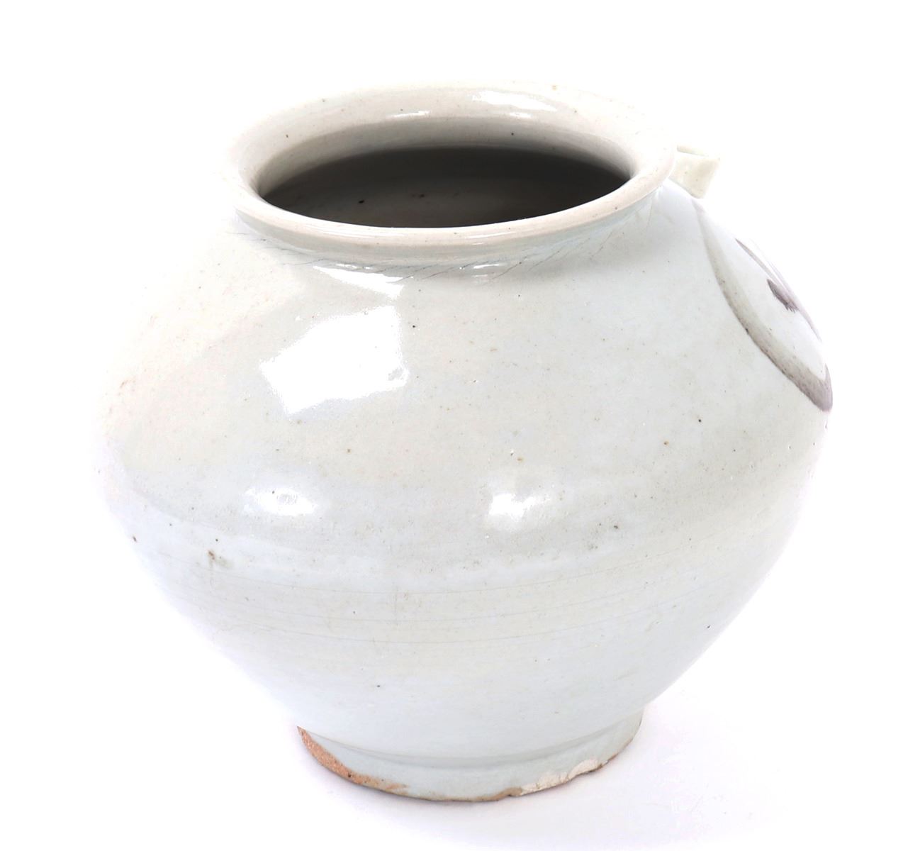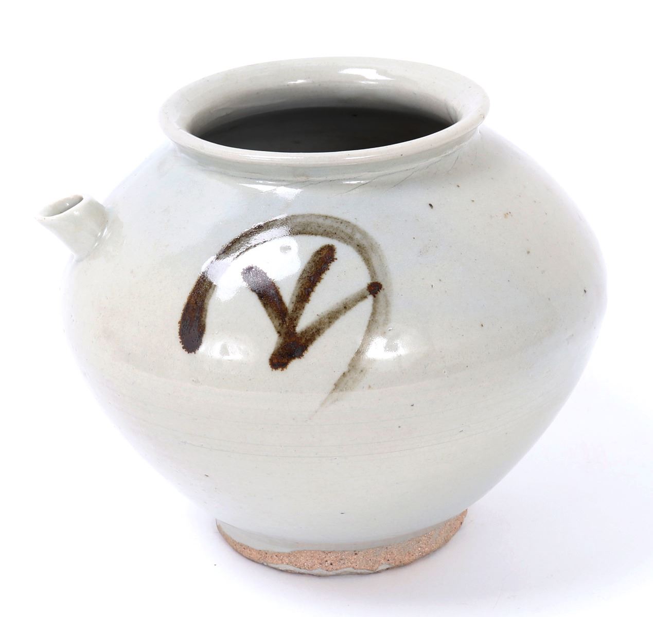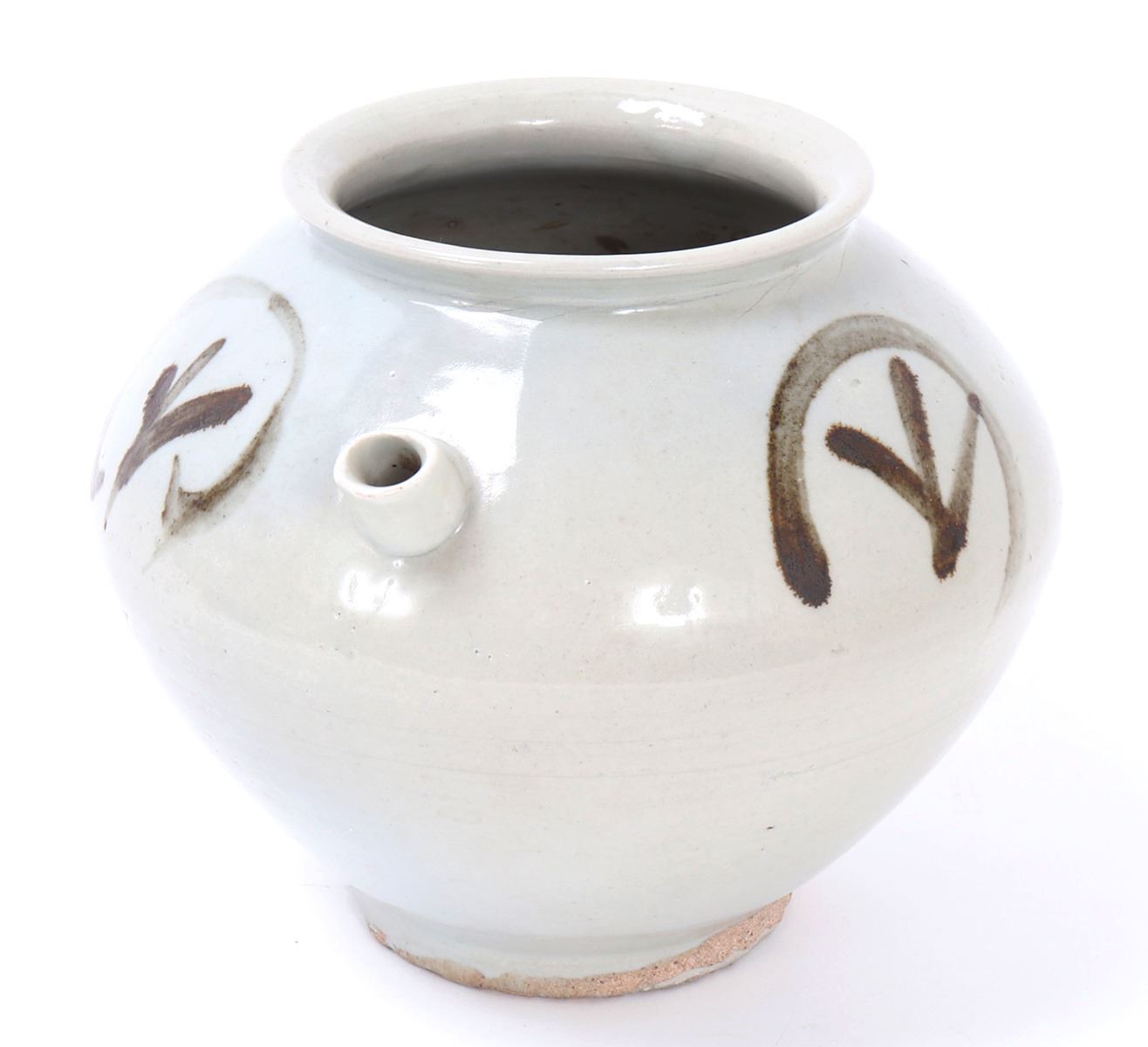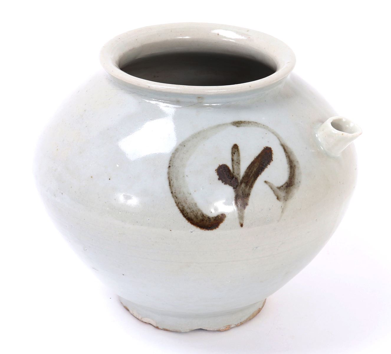 Beautiful all white glazed Korean wine or water jug in an all white glaze with an elaborate brown or black mark to the shoulders. Small squat pouring spout with large bulbous form body. Size 6 1/2" W x 5 1/2" H. Condition: Small old chips to foot with small chips to glaze as shown on foot. Else in overall good condition with no obvious signs of restoration or repair.