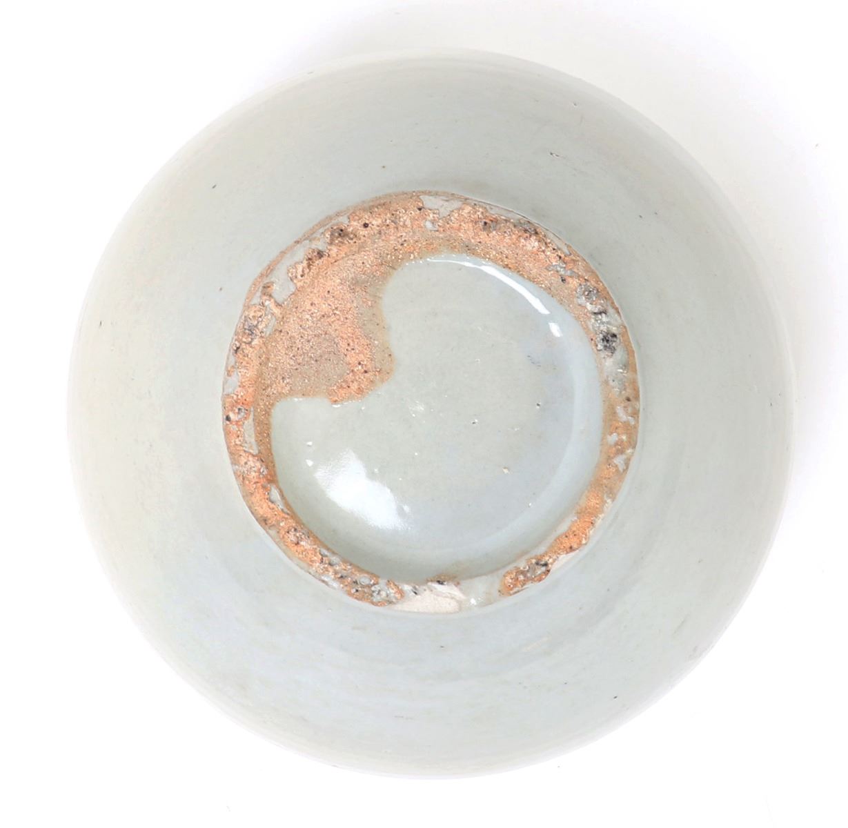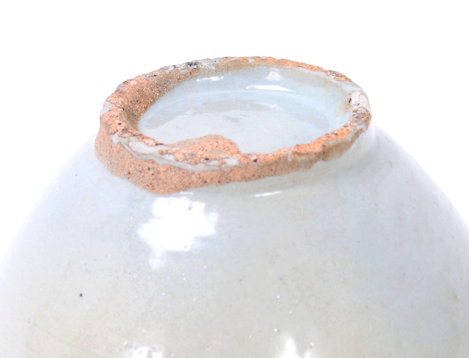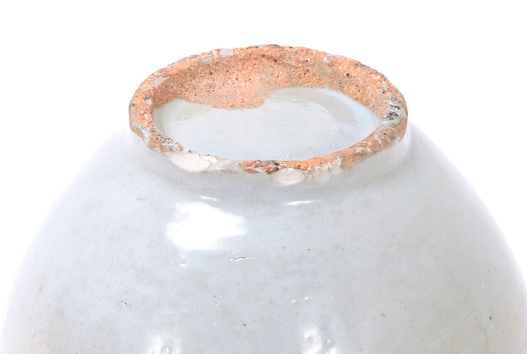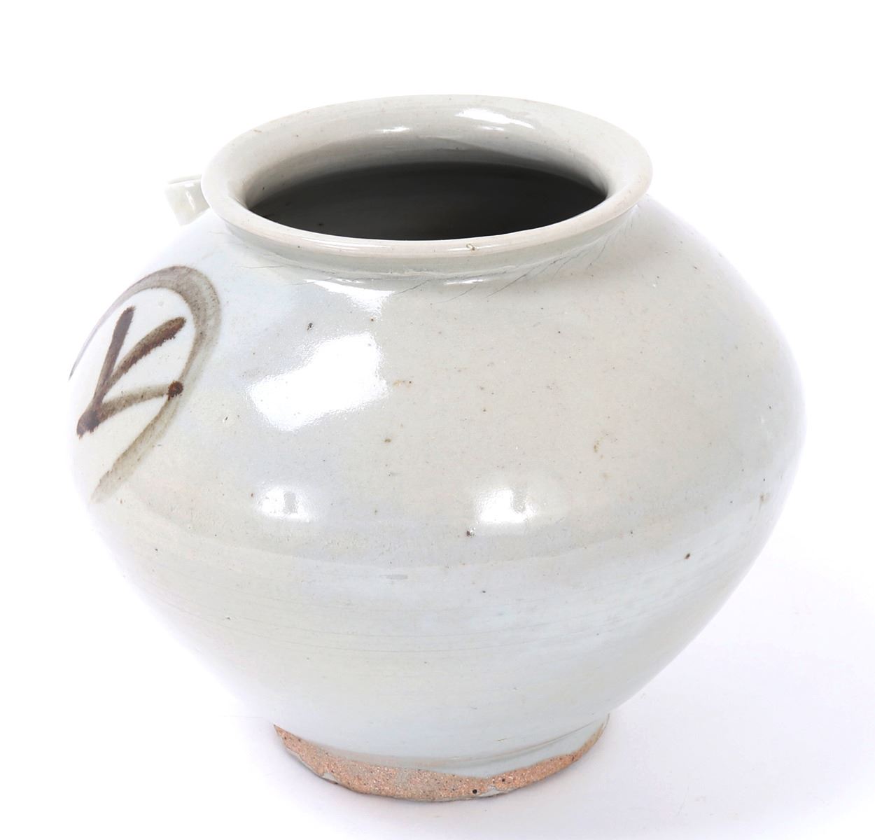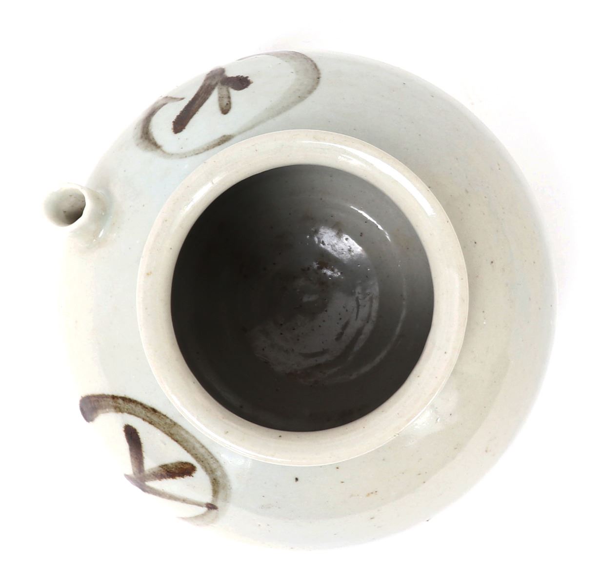 Beautiful all white glazed Korean wine or water jug in an all white glaze with an elaborate brown or black mark to the shoulders. Small squat pouring spout with large bulbous form body. Size 6 1/2" W x 5 1/2" H. Condition: Small old chips to foot with small chips to glaze as shown on foot. Else in overall good condition with no obvious signs of restoration or repair.