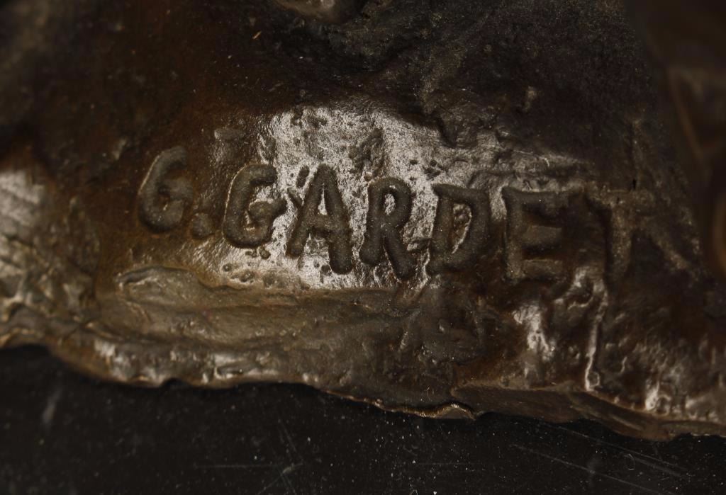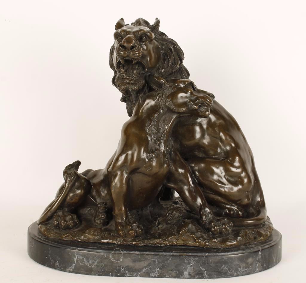 Beautiful Lion & Lioness bronze statue signed G. Gardet, on black marble base. Measures approximately 15" x 16" x 10". 'Georges Gardet (October 11, 1863 – 1939) was a French sculptor and animalier. The son of a sculptor, Gardet attended the École des Beaux-Arts in the atelier of Aimé Millet and Emmanuel Fremiet (another noted animalier). Gardet's wife Madeleine was the sister of painter and decorator Jean Francis Auburtin, who collaborated with Gardet on work for the Parisian Exposition Universelle (1900). Gardet was made an Officer of the Legion of Honor in 1900, and was a member of the Académie des Beaux-Arts, and the Society of French Artists'. Condition is Excellent.