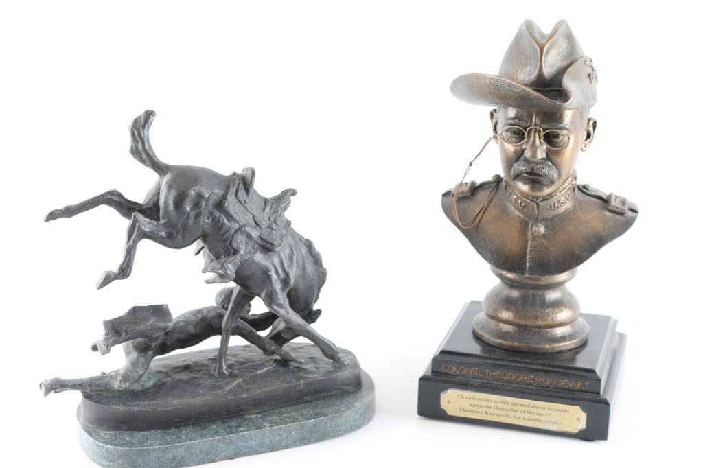 1) By Frederic Remington entitled "Wicked Pony" signed on base mounted on gray marble base. Measures 9 1/4"x9 1/2". 2) Resin Bust/statue of Col. Theodore Roosevelt on black wood base. Measures 11"X6".