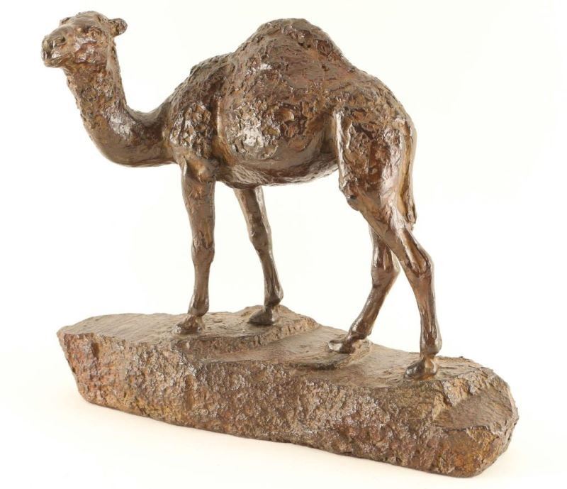 depicting a camel measures 9"X12". Number 4 of 10, signed on base.Cynthia Rigden grew up surrounded by horses and cattle on an 8,000-acre ranch that has been in her family since 1902. Her roots in Arizona and the West are deep. Yet, she doesn't call herself a "western artist;" rather she is an artist who comes from the West. In a 1997 profile in Farm and Ranch Living, she said, "During the course of a typical day, I might see a cow pony or a big old Longhorn doing something that makes me want to capture it in a bronze. Of course, just seeing something doesn't mean I can sit right down and sculpt it. I often have to do a lot of research to get all the details right. Details are very important. Folks who know horses and cattle will see right away if I get something wrong. So I have a room full of close-up photographs of every part of an animals anatomy, from its ears to its hoofs." Though she has been interested in painting since childhood - her grandmother's watercolors are still known in the Prescott area - her passion for sculpting waited until college. "I don't remember ever wanting to be anything but an artist," she said. At Arizona State University, the classes she wanted to take were filled so she took a course in sculpting. She has been profiled in Southwest Art, Arizona Highways, Contemporary Western Artists, and The Texas Cowboy. She was among women featured in Barbara Van Cleve's book, Hard Twist - Western Ranch Women. She was featured in an article in the May/June issue of Art of the West. She has exhibited in the American Women Artists and the West, Loveland Sculpture in the Park, and the Texas Cowboy Artists Award Show.