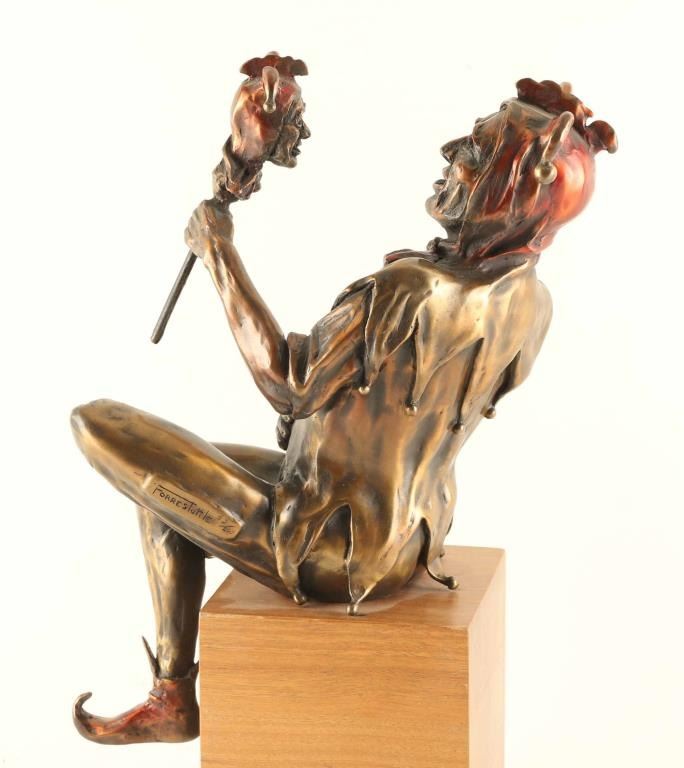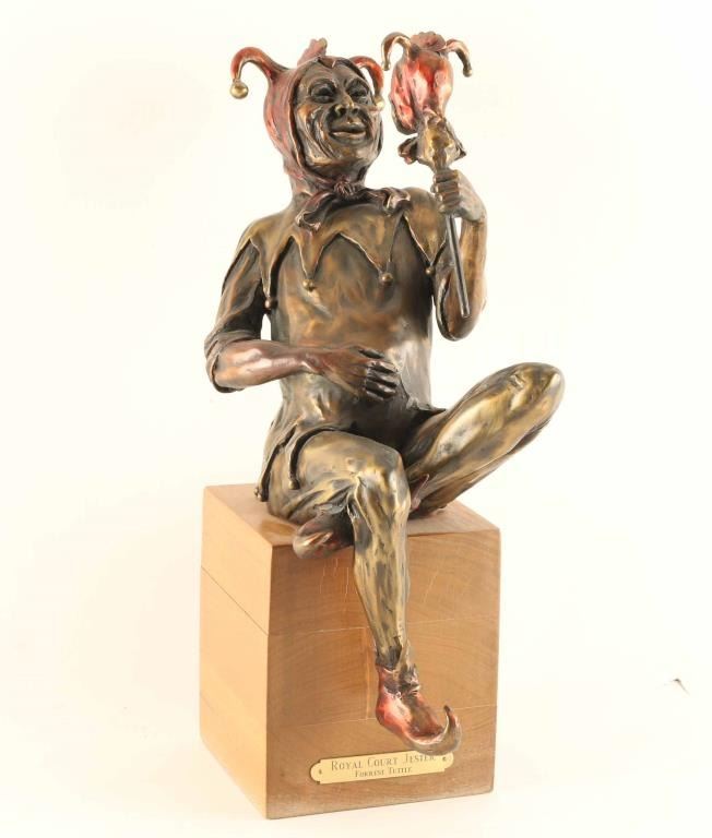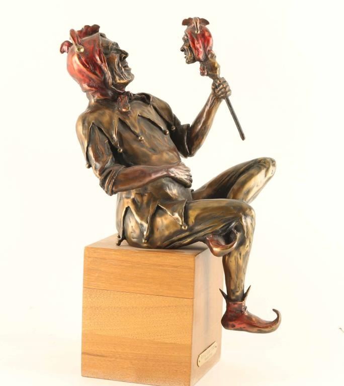 entitled "Royal Court Jester" on wood block. Measures 15" x 5". Limited edition #33/200. Signed on leg of bronze.