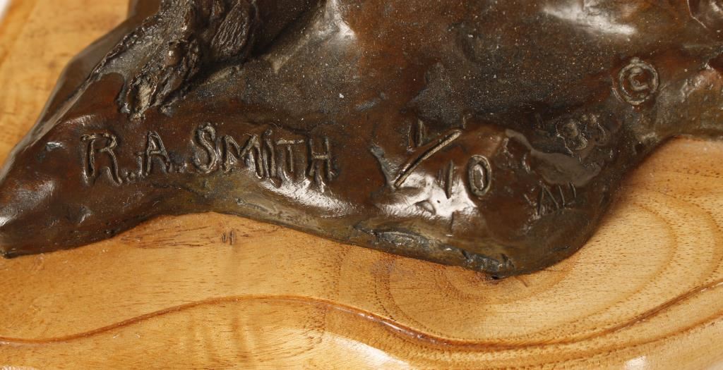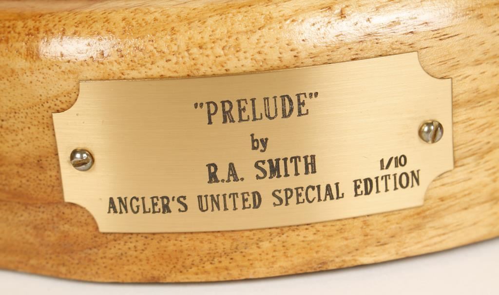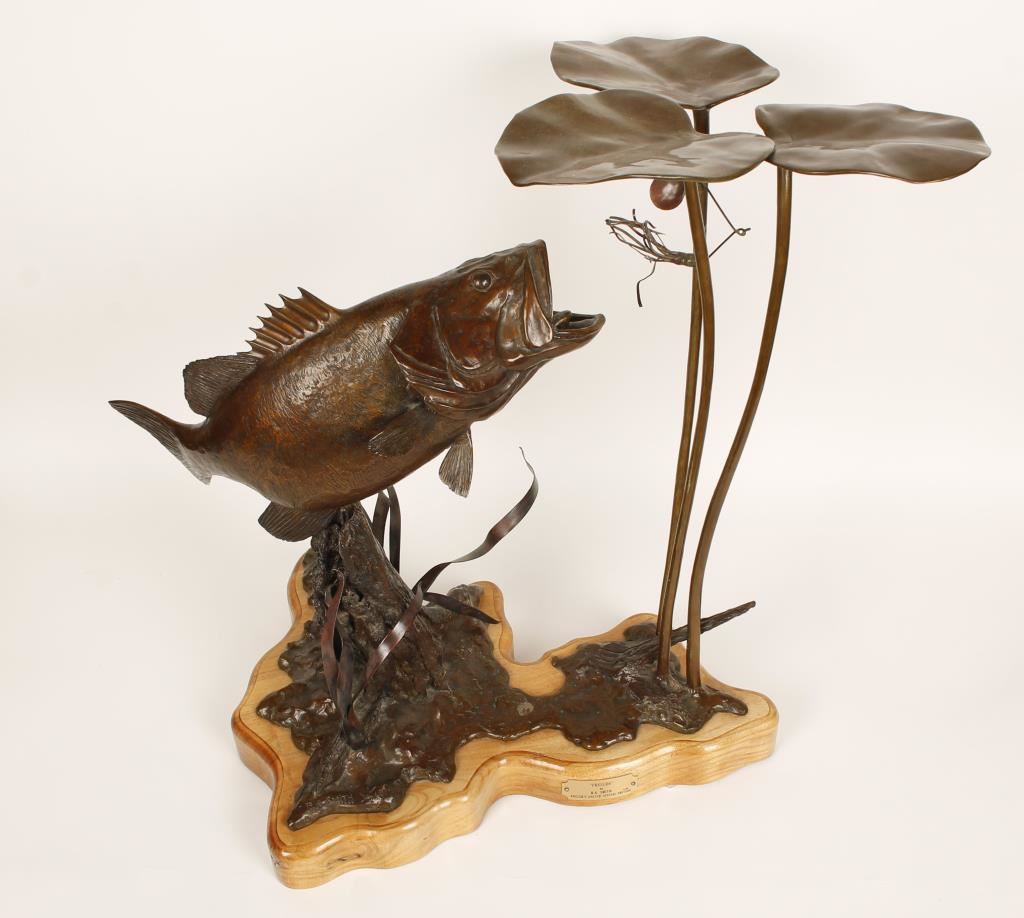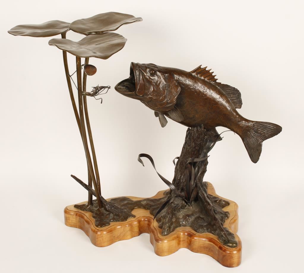 Entitled "Prelude". 19" wide, 21" tall and 14-1/2" deep. Signed and numbered "1/10" limited edition. Of a Large Mouth Bass about to strike a lure in the lily pads. Mounted on a hardwood base with plaque.