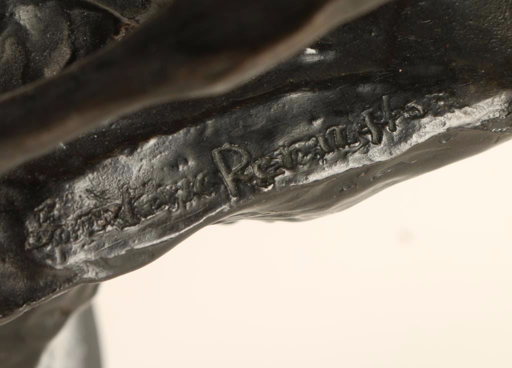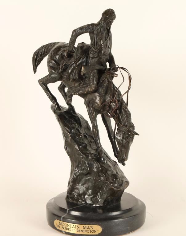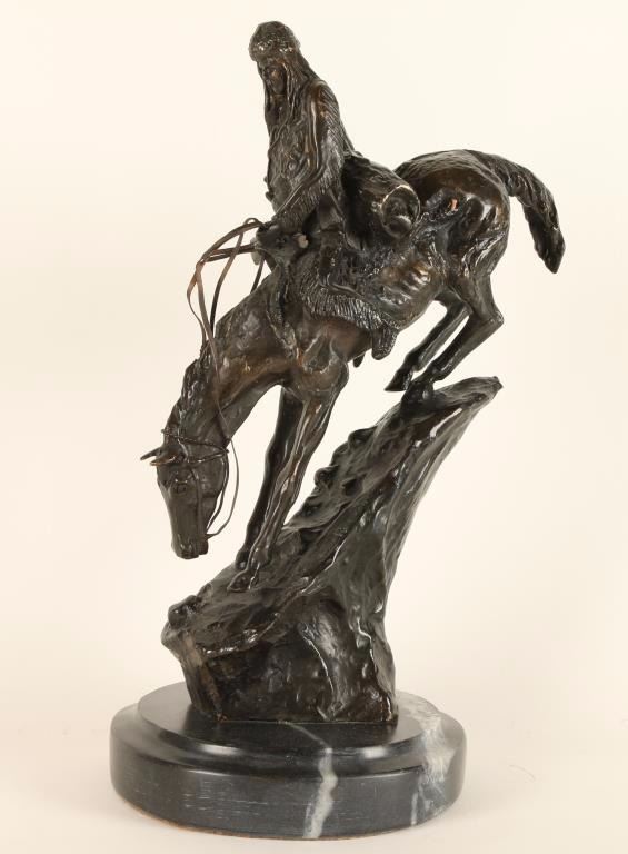 by famous western artist Frederic Remington entitled Bronco Buster. Measures 15x7, restrike, on marble base, beautiful condition.