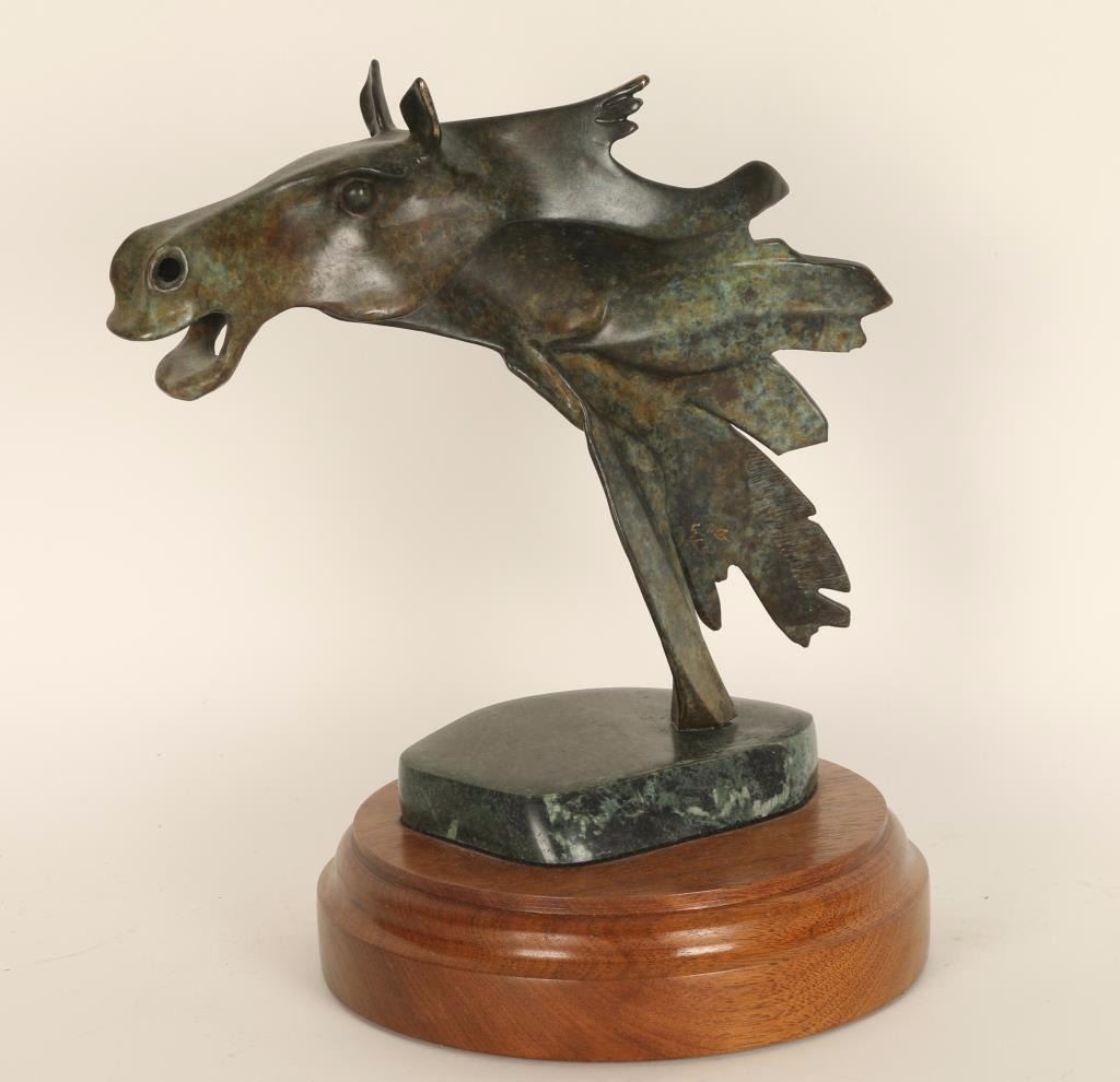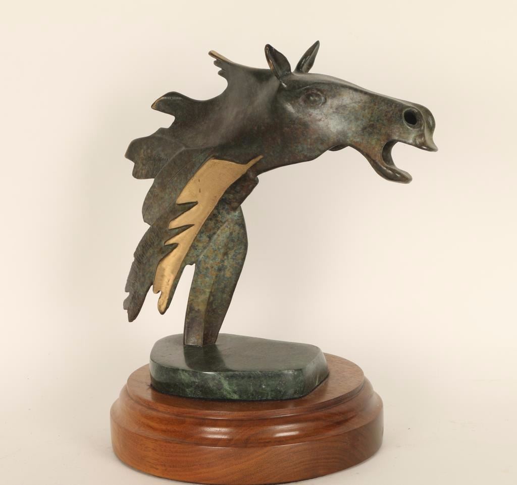 Green and gold finish depicting a horse head. Unsigned on wood base. Measures 10"x9" including base.