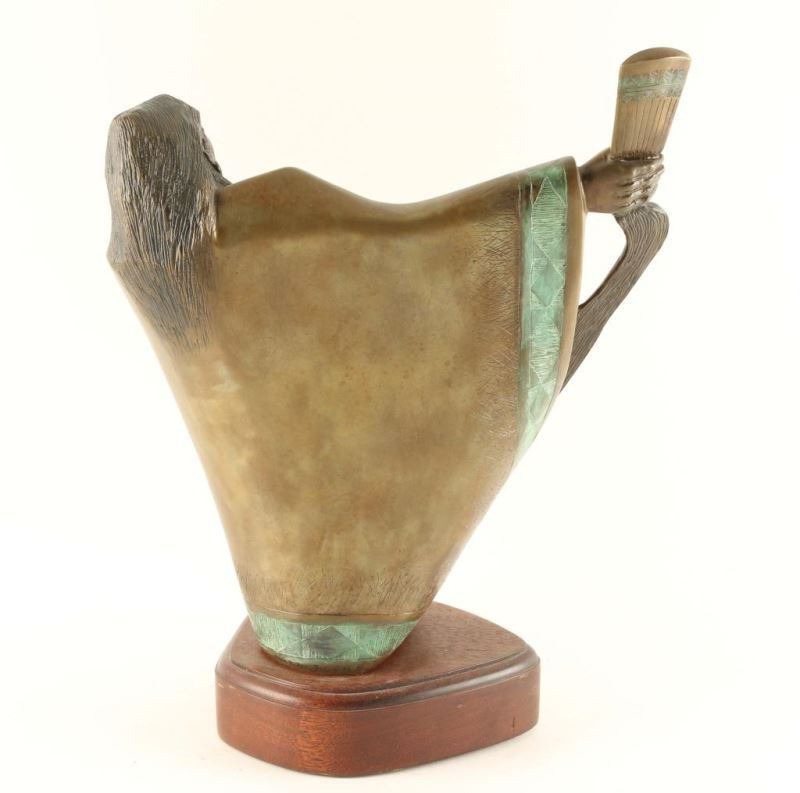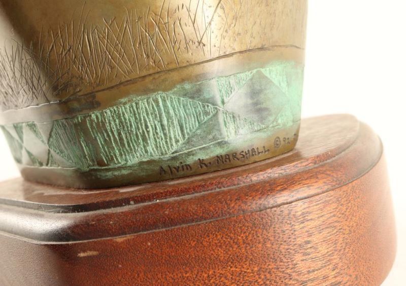 This Indian Prayer Fan Bronze Sculpture was created by Navajo, Alvin Marshall (1959- ). Originally from the Four Corners area, Alvin now resides in New Mexico. This limited edition piece depicts a Native American in a fluid and harmonious stance holding the totem that embodies the energy and spirit of the bird feathers used. The tribal dress is accented with a verdigris hem. This is #7 of 21 statues that were issued in 1992. Extremely well made and sturdy, this is about 14" tall and 11" wide & is mounted on a wood base with a metal turntable. In excellent condition & hallmarked. This absolutely beautiful, Indian Prayer Fan Bronze Sculpture tells a continuing story of Native American history from those who live it today!