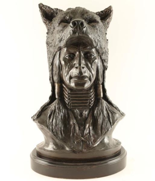 by noted Arizona artists Arthur Gruzalski, limited edition 19/33, depicting an indian bust wearing a wolf headress,20"X12".