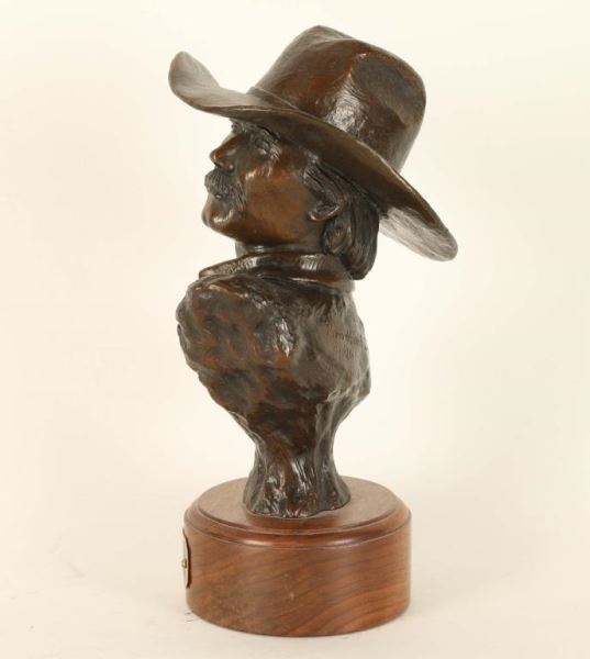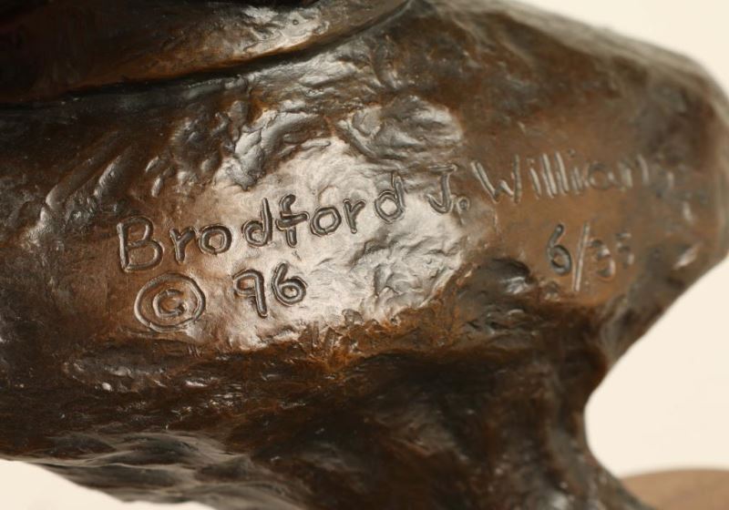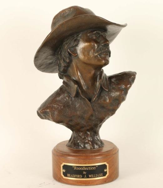 "Recollection" by Bradford J. Williams on round wood base with title plate. Signed on back 'Bradford J. Williams © 96, 6/35'. Measures 10"hx5 3/4"l x4"w. Raised in Eastern Colorado, Brad Williams is a self-taught artist, but success didn't come easily. "Each attempt at a bronzed sculpture brought me closer to that reality of becoming a successful, self-sufficient artist. I remember many long nights of sculpting after working all day at something else." By 1991, Brad was one of the most sought after artists in his genre and the demand for his work became so great that he finally became a full-time artist. His persistence paid off and he has won several awards and honors in Oklahoma, California and Arizona.