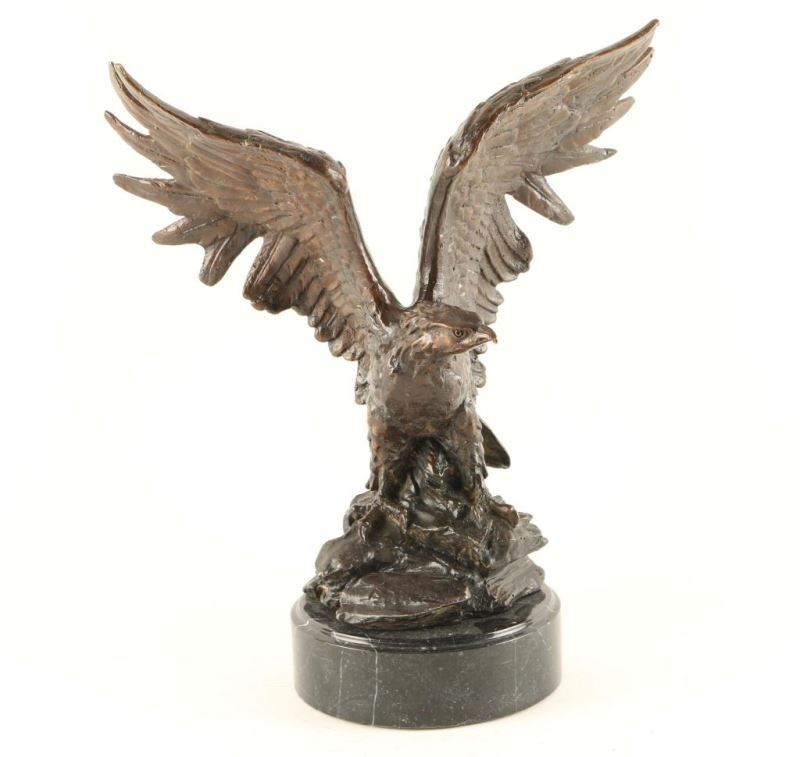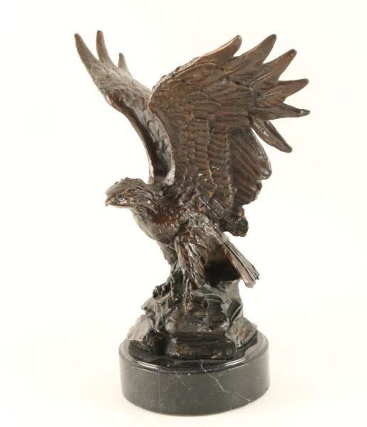 Eagle with outstretched wings sits on a black marble base. Signed by artist on base. Measures approx. 9 1/2"l x 12"h x 6"w.