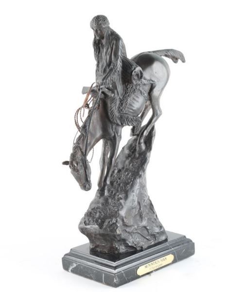 by noted western artist Frederic Remington entitled Mountain Man, signed in bronze, measures 6.5"x14". On black marble base