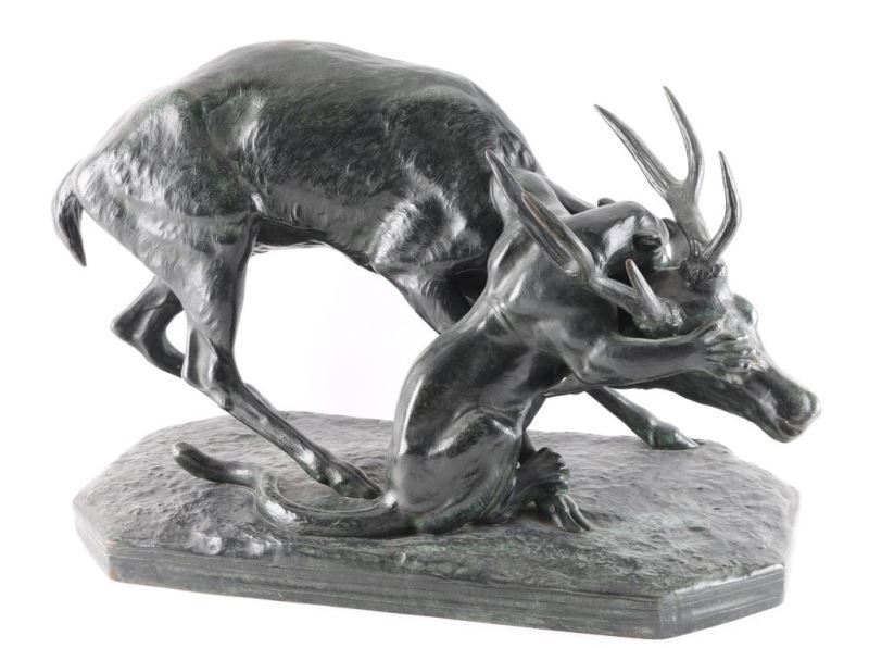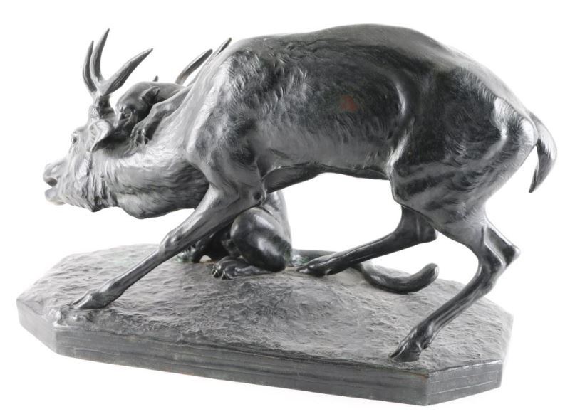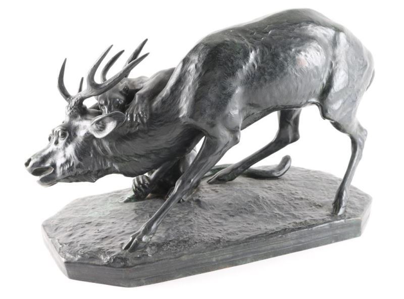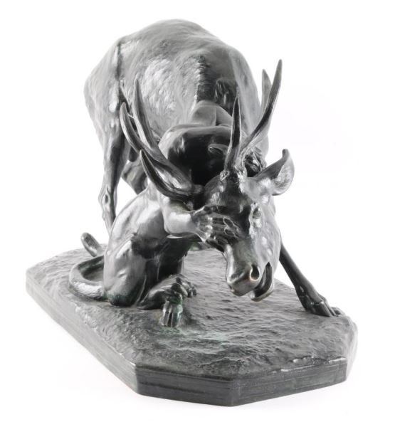 by Barye depicting Elk and Mountain Lion Foundry Mark "Susse Fres Editeurs Paris" Antione Louis Barye.Antoine-Louis Barye, (born September 24, 1795, Paris, France—died June 25, 1875, Paris), prolific French sculptor, painter, and printmaker whose subject was primarily animals. He is known as the father of the modern Animalier school. Measures 19"x13".