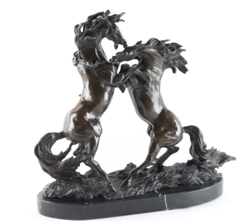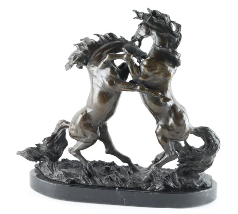 by Griffin depicting two fighting horses, signed in bronze on black marble base. Measures 15.5"x15"