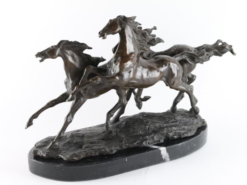 By Griffin depicting three running horses signed in bronze. Measures 14"x 10" on black marble base.