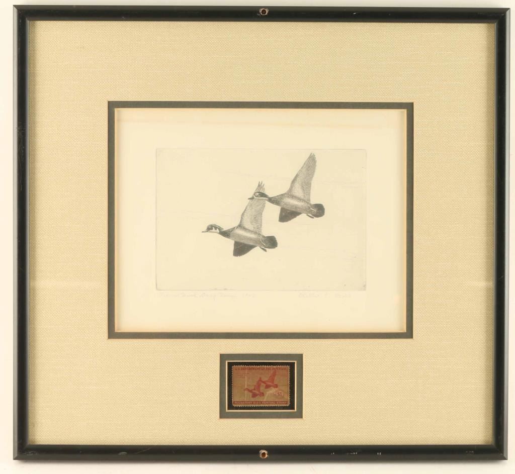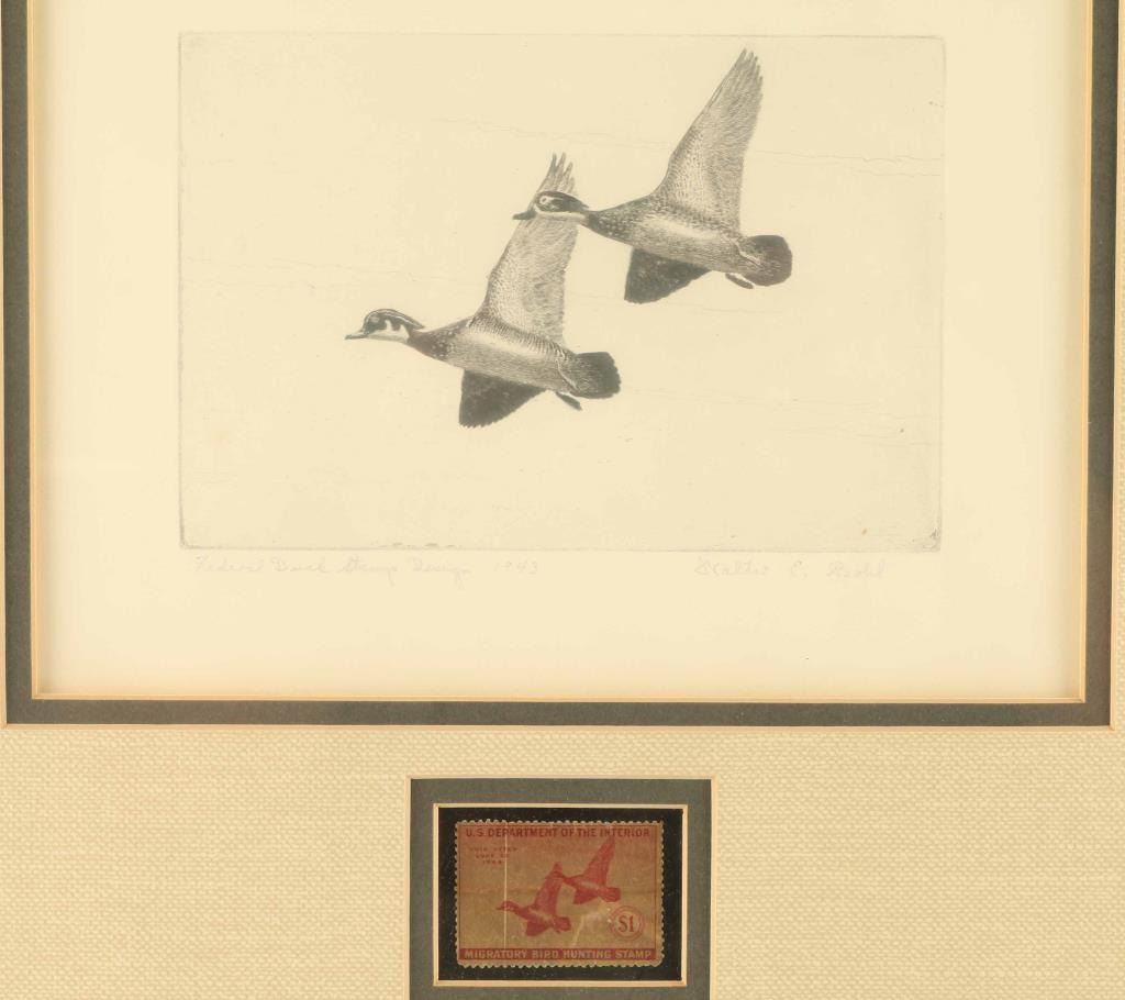 "Federal Duck Stamp Design 1943", artwork done by Walther Bohl, hand signed in pencil includes the stamp and witching framed together measures 9.5X8"