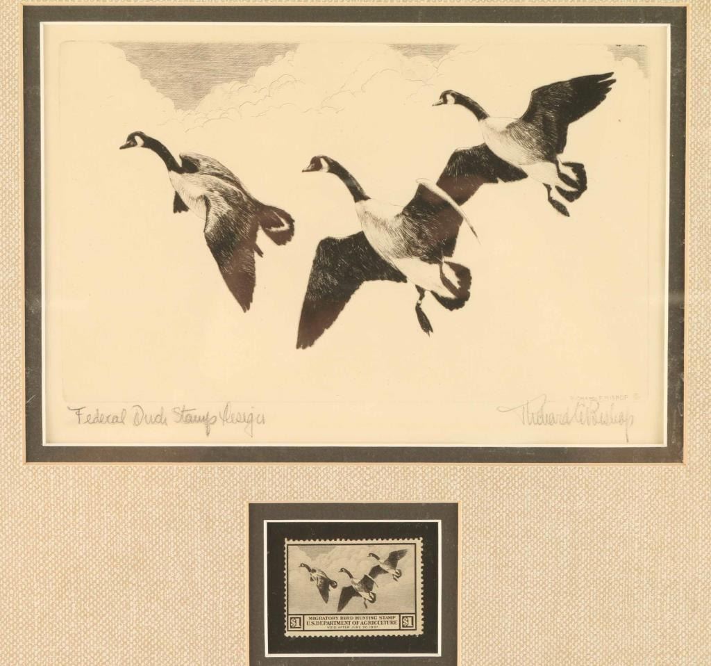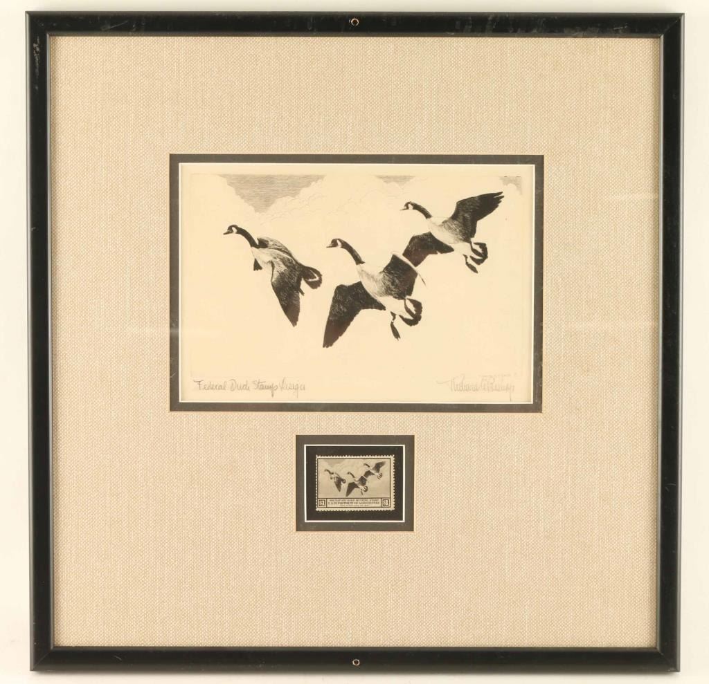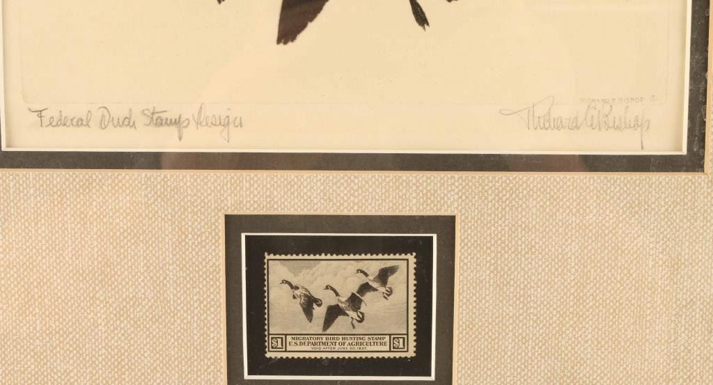 by Richard Bishop entitled Federal Duck Stamp Design, hand signed in pencil. Also included is the stamp used in the artwork. Double matted and framed 9"x6".