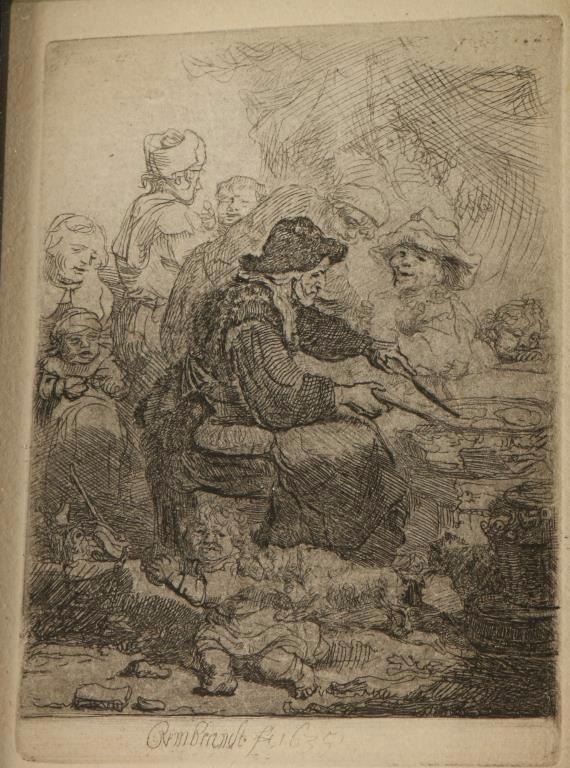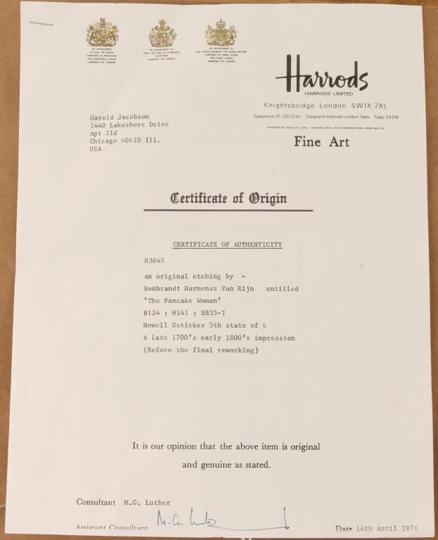 by noted world famous old master artist Rembrandt Riji. Entitled "The Pancake Woman", signed Rembrandt in etching New Holstein 6th state of 7, Basan impression 1780-1810, very rare. Also a Nowell Ustickes 5th state of 6, a late 1700's early 1800's impression. Includes a copy of the certificate of Origin from Harrods of London with copy of original receipt. Signed by M.G. Luther.