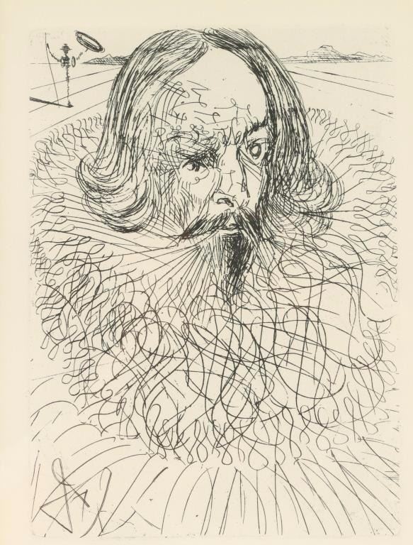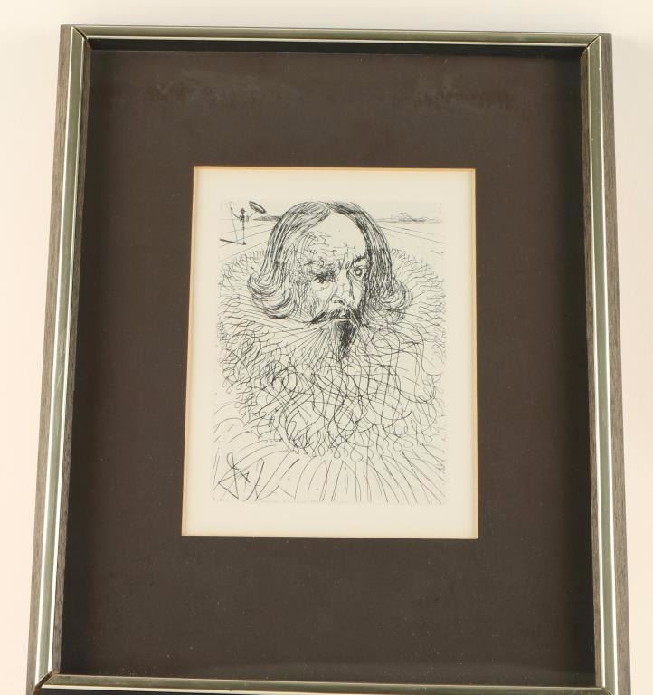 by world famous artist Salvador Dali entitled 'Cervantes". Includes a certificate of authenticity from Nouvelle Gravuere Internationale. Image measures 8 1/2"x6" with black mat and black and silver frame.