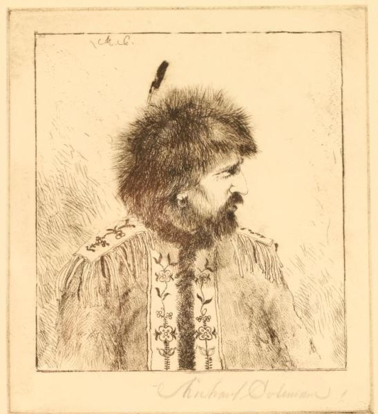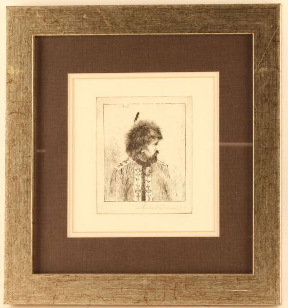By noted CA artist Michael Coleman depicting mountain man, signed in lower right hand corner. Image size 6.5"6.5. Double matted in pewter frame.