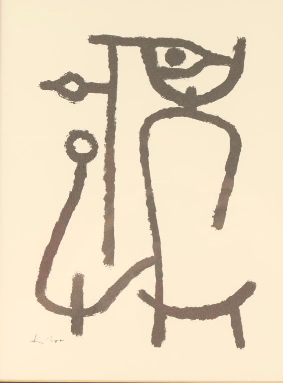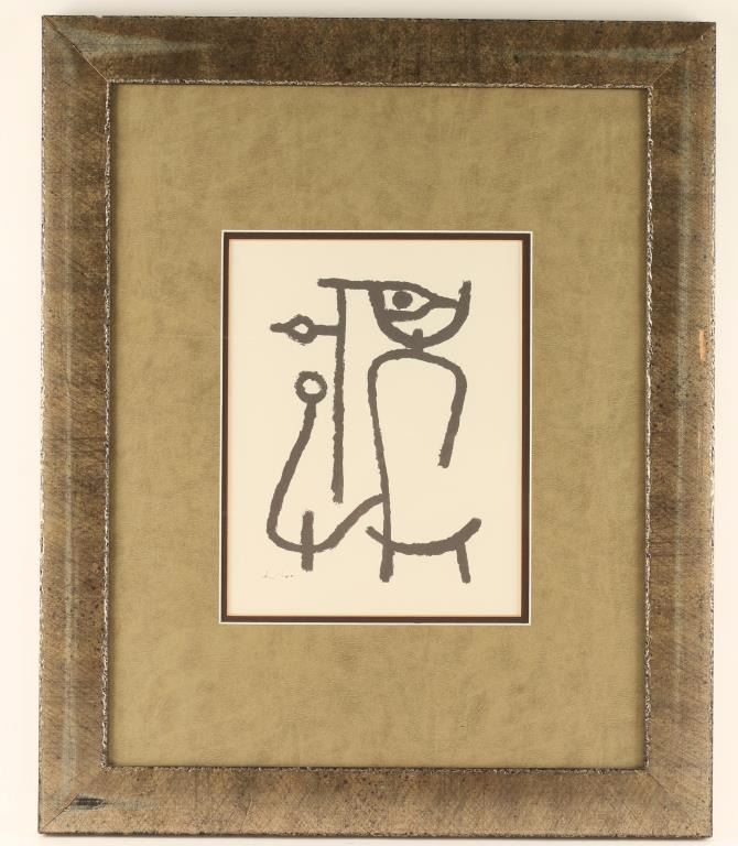 by noted artist Paul Klee hand signed in pen lower right hand corner. Entitled Lady Apart. Image size is 11"X9". In metallic frame. A Swiss-born painter and graphic artist, Paul Klee was born on December 18, 1879, in Munchenbuchsee, Switzerland, into a family of musicians. His personal, often gently humorous works are filled with allusions to dreams, music, and poetry, and are difficult to classify. Primitive art, surrealism, cubism, and children's art all seem blended into his small-scale, delicate paintings, watercolors, and drawings. Klee grew up in a musical family and was himself a violinist. His childhood love of music was always to remain important in his life and work. From 1898 to 1901, Klee studied in Munich, first with Heinrich Knirr, then at the Kunstakademie under Franz von Stuck. Upon completing his schooling, he traveled to Italy in the first of a series of trips abroad that nourished his visual sensibilities. While in Italy (1901-02), he responded enthusiastically to Early Christian and Byzantine art. He settled in Bern in 1902. Klee's early works are mostly etchings and pen-and-ink drawings. These combine satirical, grotesque, and surreal elements, and some reveal the influence of Francisco de Goya and James Ensor, both of whom Klee admired. Two of his best-known etchings, dating from 1903, are 'Virgin in a Tree' and 'Two Men Meet, Each Believing the Other to Be of Higher Rank'. Such peculiar, evocative titles are characteristic of Klee, and give his works an added dimension of meaning. After his marriage in 1906 to the pianist Lili Stumpf, Klee settled in Munich, then an important center for avant-garde art. That same year he exhibited his etchings for the first time. His friendship with the painters Wassily Kandinsky and August Macke prompted him to join Der Blaue Reiter (The Blue Rider), an expressionist group that contributed much to the development of abstract art. A turning point in Klee's career was his visit to Tunisia with Macke and Louis Molliet in 1914. He was so overwhelmed by the intense light there that he wrote: "Color has taken possession of me; no longer do I have to chase after it, I know that it has hold of me forever. That is the significance of this blessed moment. Color and I are one. I am a painter". In 1920, a major Klee retrospective was held at the Galerie Hans Goltz, Munich; his Schöpferische Konfession was published; he was also appointed to the faculty of the Bauhaus. Klee taught at the Bauhaus in Weimar from 1921 to 1926 and in Dessau from 1926 to 1931. During his tenure, he was in close contact with other Bauhaus masters, such as Kandinsky and Lyonel Feininger. In 1924, the Blaue Vier, consisting of Lyonel Feininger, Jawlensky, Kandinsky, and Klee, was founded. Among his notable exhibitions of this period were his first in the United States at the Société Anonyme, New York, in 1924; his first major show in Paris the following year at the Galerie Vavin-Raspail; and an exhibition at the Museum of Modern Art, New York, in 1930. Klee went to Düsseldorf to teach at the Akademie in 1931, shortly before the Nazis closed the Bauhaus. Forced by the Nazis to leave his position in Düsseldorf in 1933, Klee settled in Bern the following year. Seventeen of his works were included in the Nazi exhibition of "degenerate art," Entartete Kunst, in 1937. Major Klee exhibitions took place in Bern and Basel in 1935 and in Zurich in 1940. Klee died on June 29, 1940, in Muralto-Locarno, Switzerland.