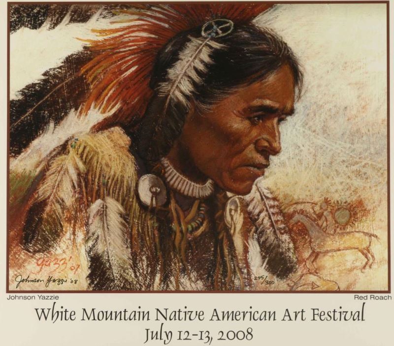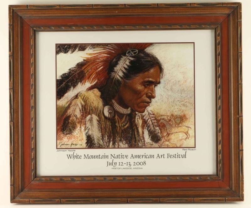 'White Mountain Native American Art Festival July 12-13, 2008, Pinetop-Lakeside, Arizona' poster 245/300. Depicting Native American by Johnson Yazzie. Signature lower left. Image measures 17 1/8" x 21 1/2" in carved wood frame.