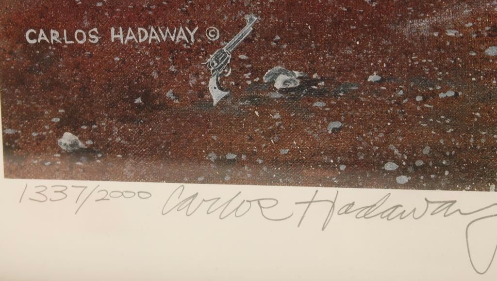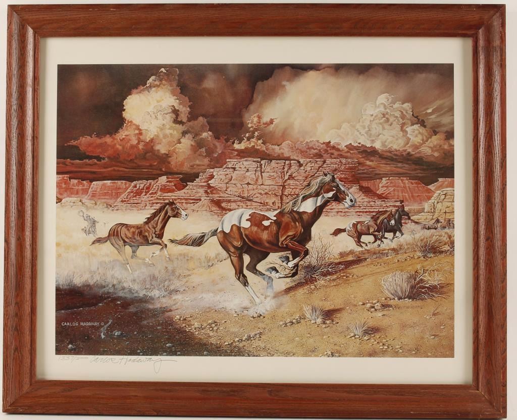 Framed limited edition print by Arizona artist Carlos Hadaway. Carlos is perhaps most well known for his license with Anheuser-Busch, where he created a series of six western prints featuring Budweiser. Hand signed and numbered 1337/2000. Image size measures 18" x 13". Condition is very good.