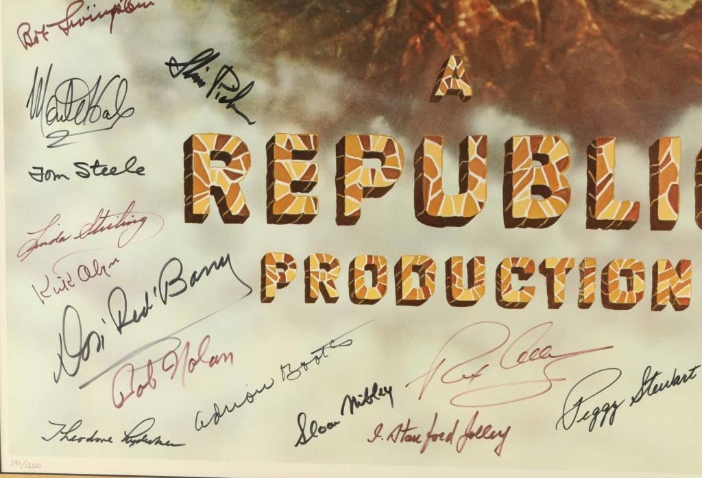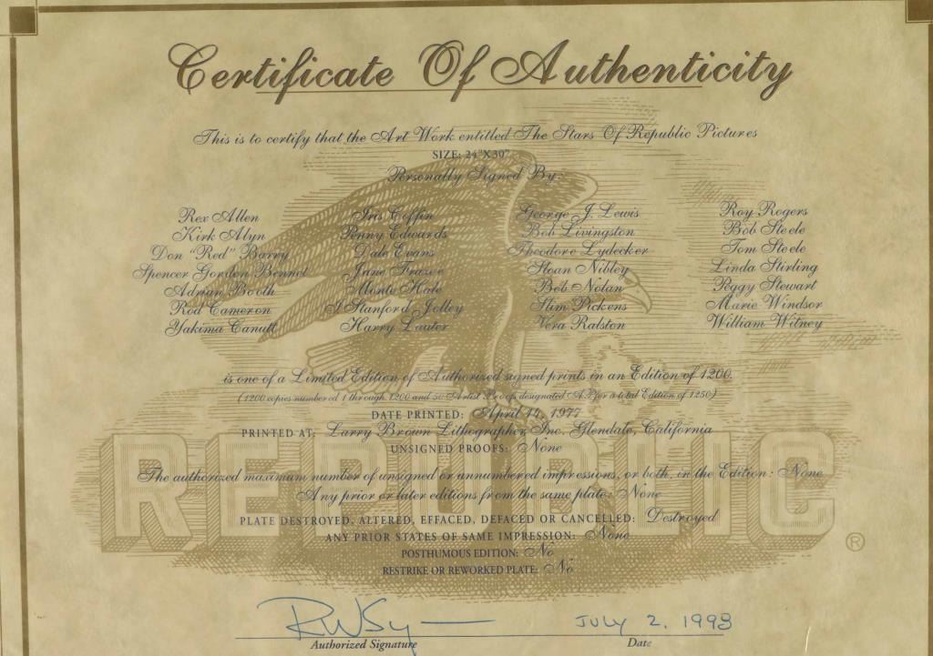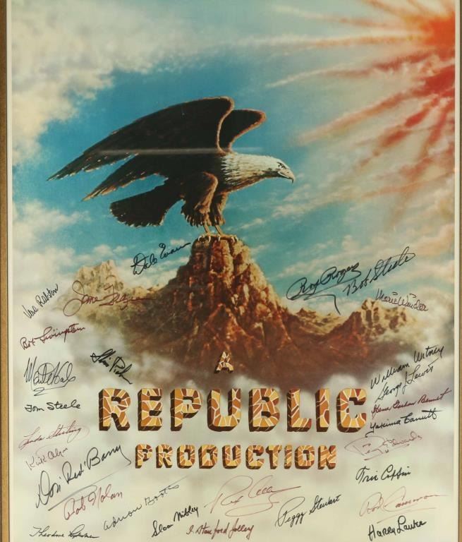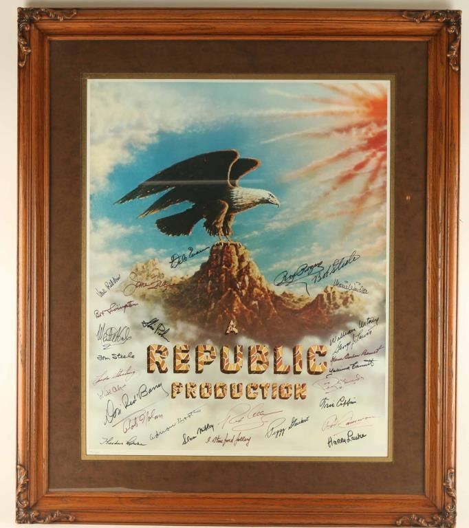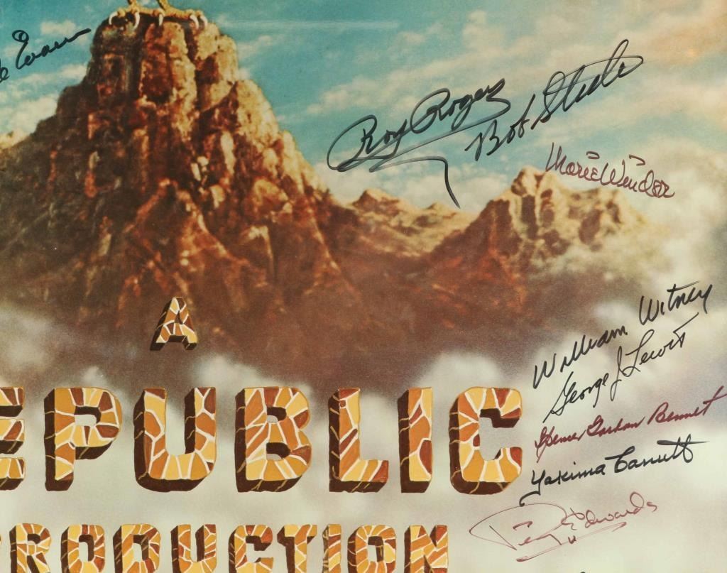 personally signed by Rex Allen, Kirk Allen, Don "Red" Barry, Spencer Gordon Bennett, Adrian Booth, Rod Cameron, Yakima Canutt, Iris Coffin Perry Edwards, Dale Evans, June Frazee, Monte Hale, J. Stanford Jolley, Harry Lauter, George Lewis, Bob Livingston, Theodore Lydecker, Sloan Nibley, Bob Nolan, Slim Pickens, Vera Ralston, Roy Rogers, Bob Steele, Tom Steele, Linda Stirling, Peggy Stewart, Marie Windsor, and William Witney. Includes a certificate of Authenticity. Measures 24"x30 double matted in wood frame.