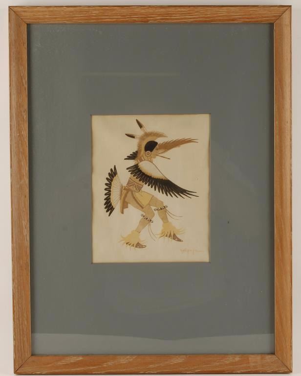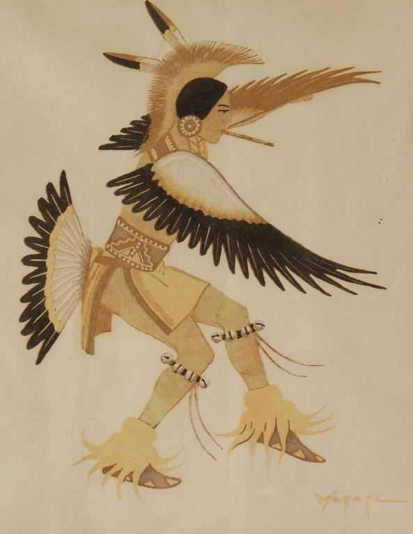 by Oklahoma artist Stephen Mopope. Depicting Kachina Dancer. Matted and framed. 10"X7" Bio- Stephen Mopope Qued Koi, Wood-Coy, "Painted Robe" (1898-1974), was born and raised on the Kiowa Reservation, Indian Territory, later to become Oklahoma. He was primarily a painter and dancer most of his life. "Mopope's grandfather was a Spanish captive, kidnapped by the Kiowas from a wagon train crossing the prairie and reared by Chief Many Bears. On the Kiowa side he was a descendant of Appiatan, a noted Kiowa warrior. His granduncles were Silverhorn (Haungooah) and Hakok. They found him drawing designs in the sand and decided to teach him how to paint on tanned skins in the old Kiowa way. Mopope's childhood education by his grandmother was in the Kiowa tradition. [He also studied with Susie Peters of the Kiowa Agency in Anadarko, Oklahoma, and at the University of Oklahoma, Norman, in the late 1920s]. He is one of the original Kiowa Five [the "Five Kiowas" at the University of Oklahoma] and was primarily a painter and dancer most of his life." Source: Snodgrass, American Indian Painters 1968. Stephen Mopope broke out of the Kiowa tradition of painting by including more figures in his narrative paintings. His work is represented in Kiowa Art and his paintings have been exhibited all over the world. His commissions include murals for the United States Department of the Interior, Washington, D.C. (I938), as well as works sponsored by the Works Progress Administration and the Public Works Administration. Mopope's many awards include a Certificate of Appreciation by the Indian Arts and Crafts Board, United States Department of the Interior.