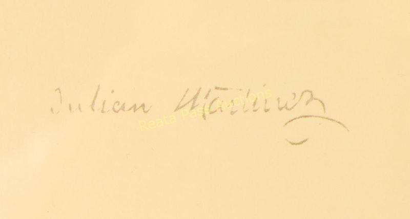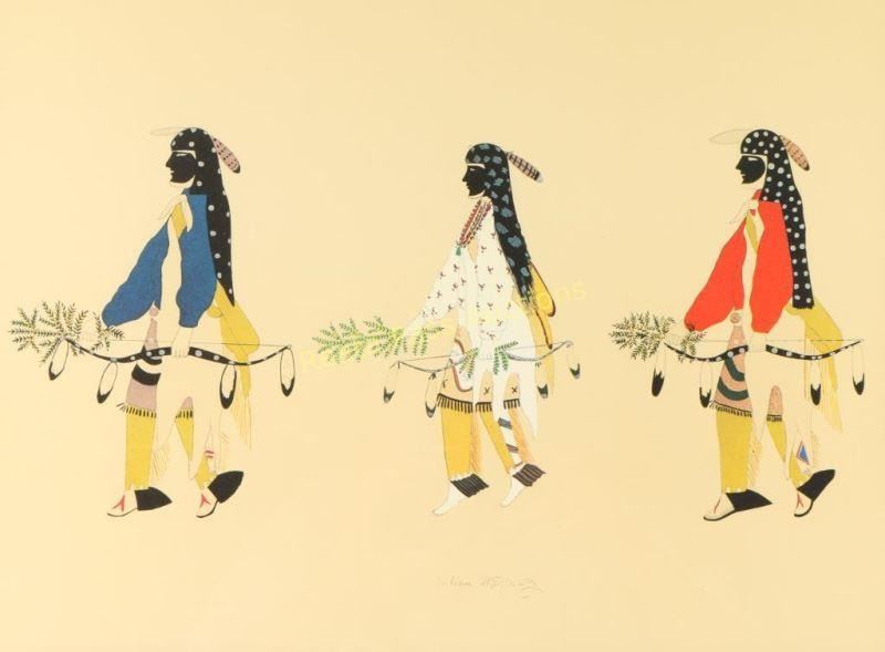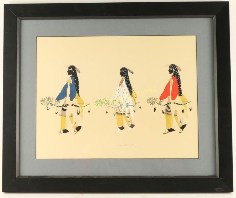 by Julian Martinez depicting 3 Native American men with bows and branches. Image measures 17"x13" in single mat and black wood frame. Julián Martinez Pocano (Coming of the Spirits) was born in San Ildefonso Pueblo in New Mexico, and died in San Ildefonso Pueblo. He is perhaps best known for the designs he painted on his wife Maria's famous pottery. Martinez had no formal art training. He was the father of Tony Martinez (Popovi Da), also a well known Pueblo artist. In addition to artist, Martinez listed his occupation as "farmer, laborer, janitor, and pottery designer," (Lester, p. 343). He also served as Governor of San Ildefonso Pueblo. According to Snodgrass, Martinez had been painting since 1920 and had gone through several periods of 'realistic' paintings, but some of his more outstanding works were his abstract symbolic and geometric designs found on Maria's pottery. Martinez' paintings were among those selected by Mary Jane Colter to decorate the La Fonda Hotel in Santa Fe, New Mexico. He received several commissions for murals, which can be seen at the Santa Fe Indian School; Mesa Verde National Park, Colorado (1935); and at the School of American Research in Santa Fe. Martinez' paintings are in numerous public collections including: Amon Carter Museum of Art, Fort Worth, Texas; Amerind Foundation, Dragoon, Arizona; Arizona State Museum, University of Arizona, Tucson, Arizona; Cincinnati Art Museum, Cincinnati, Ohio; Columbus Gallery of Fine Arts, Columbus, Ohio; Cleveland Museum of Art, Cleveland, Ohio; Denver Art Museum, Denver, Colorado; Dartmouth College Collection, Hanover, New Hampshire; Thomas Gilcrease Institute of American History and Art, and many others.