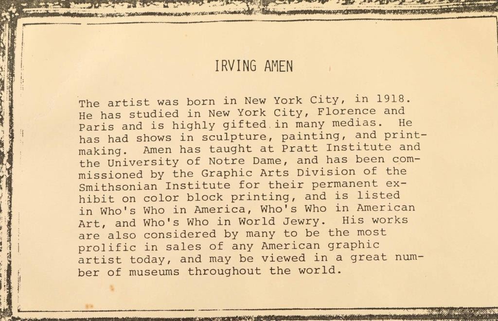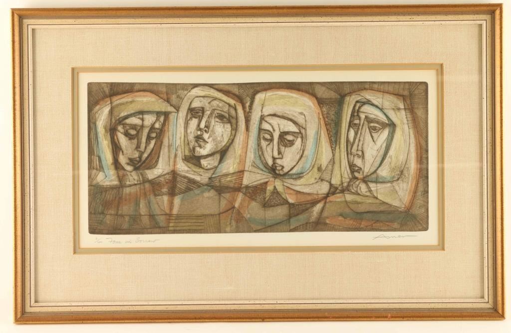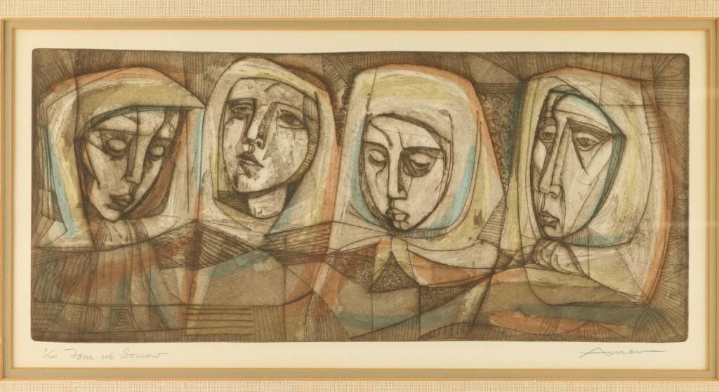 by Irving Amen entitled "Four in Sorrow". #3/200, signed in the lower right hand corner. Depicts four faces experiencing sorrow. Framed and double matted with image size 18 1/2" x 10".