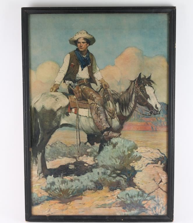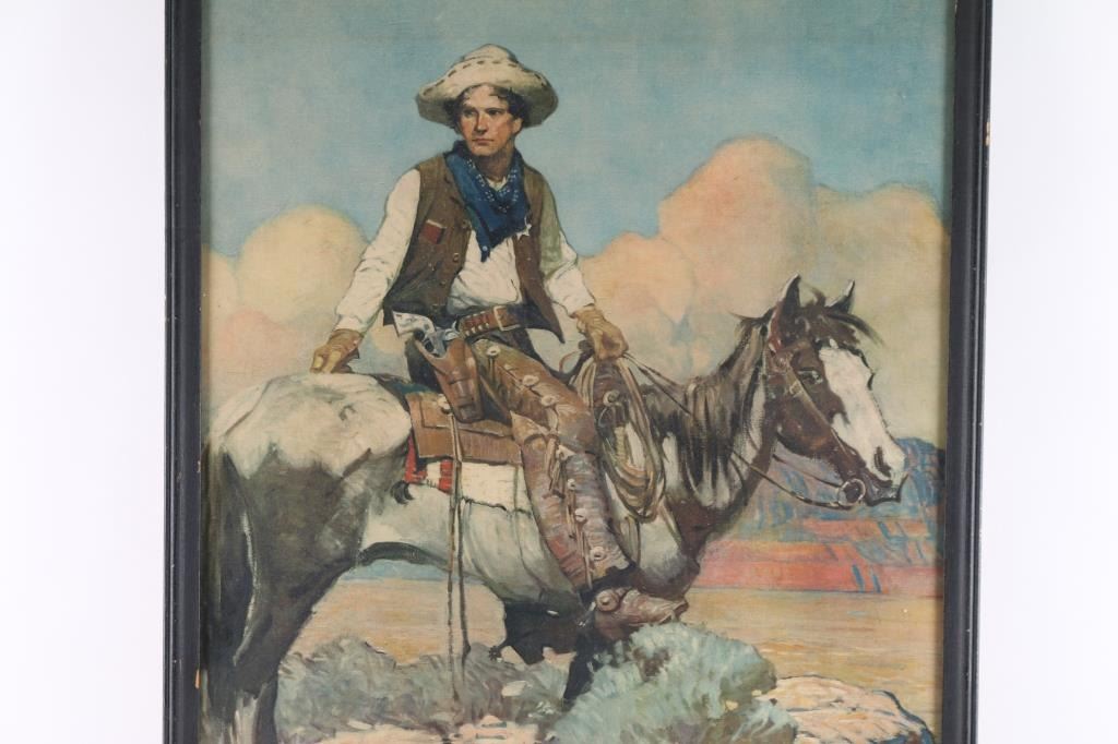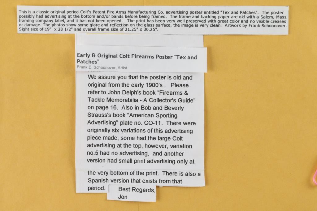 Vintage, Tex and Patches Original COLT advertising poster. Number #5 - No "Colt" - the original painting by Charles Schoonover. Born in Oxford, New Jersey, an industrial town, Frank Schoonover earned a reputation as a skilled illustrator and as a portrait, figure and landscape painter of lively western scenes. He was also a teacher from his studio and from the John Herron Art Institute. This painting is from a founding member of Colt Collectors Association, vetted by Colt Memorabilia Expert, Earl Whitney of C.C.A. Image measures 19x28 in a 1" black, wood frame,with dings.