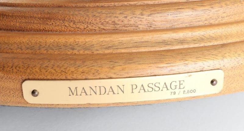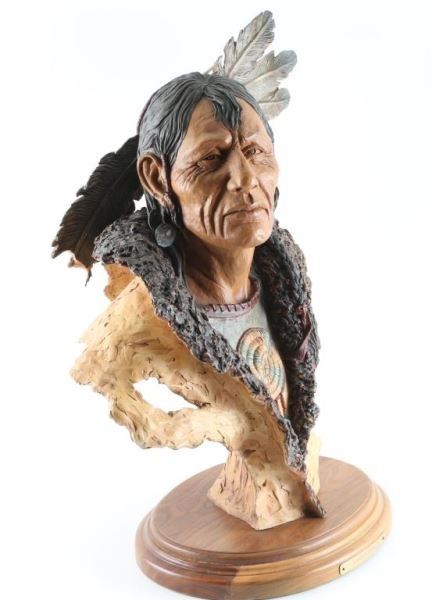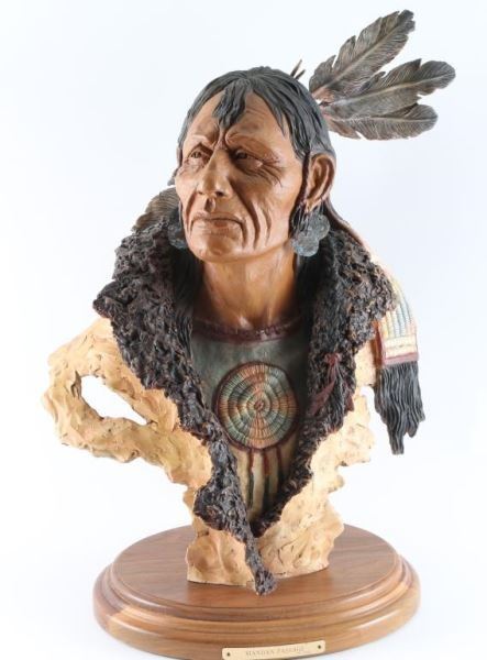by Herro signed entitled Mandan Passage depicting indian chief 20"x12" mounted on wood base and has broken feather in the back.