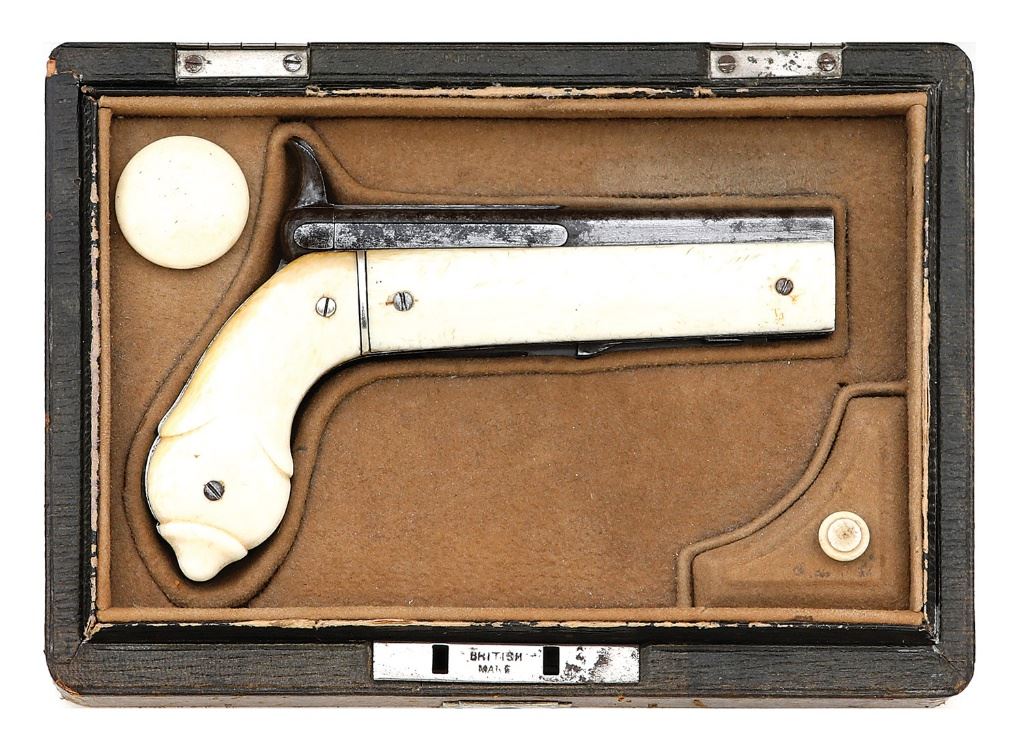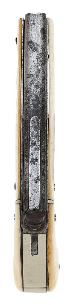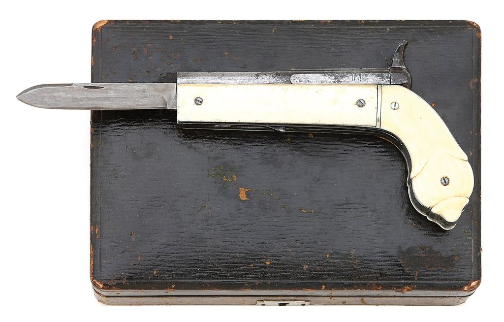 .25 cal, 3 3/4'' barrel with a moderately oxidized smooth bore and 2 7/8'' folding spear-point knife. The metal surfaces show an old light cleaning now mostly toned to pewter gunmetal patina with some gray-brown undertones and remnants of light pitting along the barrel. The breech end of the barrel has nice raised flats and the knife is mostly a pale gray-brown tone. This pistol appears to be unmarked, usually they were marked on the knife blade, though the style of the grip frame and other features match those of other Berthod-marked pistols. The German silver grip frame remains in excellent condition and the pistol is equipped with attractive smooth antique ivory grips and side panels that exhibit a mellow patina, some nice grain striations and scattered light handling marks. The pistol is equipped with folding trigger and seems to function normally. The pistol is housed in its original leather-covered case in lovely condition showing some light flaking and scuffing to be expected along the exterior. The lock hardware is nickel-plated and shows ''BRITISH MAKE'' stamp and the interior is lined in nice buff chamois and French-fitted to the gun. There is a small lidded compartment along with a tiny ivory container suitable for holding a couple of percussion caps. A lovely and interesting piece for the advanced antique arms collector. (13C11777-18) {ANTIQUE} (4000/6000)