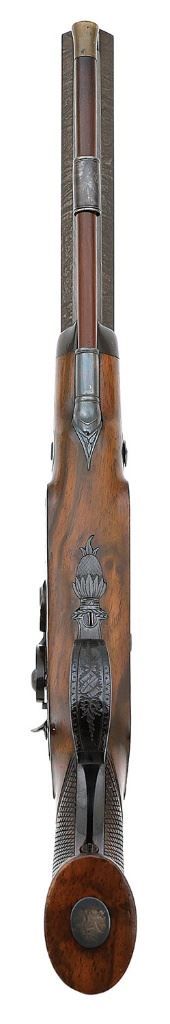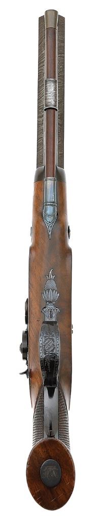 36 Bore (.50 cal), 10'' octagon damascus barrels with mostly bright very good plus bores showing a little mild oxidation and fine rifling throughout. This lovely pair of pistols show a very old and nicely executed restoration, likely done in England, with the barrels retaining essentially all of their lovely contrasting deep plum-brown and gray twist patterns. The top flats retain strong maker markings neatly engraved ''CLARK-HOLBORN-LONDON'' and the breeches show nice swirling cap deflectors and platinum blowout plugs. The lockplates retain 99% attractive dark smoky case-hardened colors and retain strong maker name, dolphin head hammers and light English foliate scrollwork that has softened very slightly in a few areas. The tailpipes and triggerguard retain about 98% excellent quality rich bright blue showing nice stands of arms embellished along the bows of the guard and attractive pineapple finials. There are silver wedge escutcheons and the remaining small parts show nice brilliant fire blue. The flat bottom grips show an inlaid silver monogram plate engraved with a familial crest with unicorn head above coronet flanked by palms. The checkered short-gripped walnut stocks remain in very fine condition as lightly refurbished showing some scattered light dings and handling marks, one pistol with a minor crack at the lock screw. The wood exhibits some areas of nice subtle figure and the stocks feature nice flattop checkering with mullered borders and horn forend tips. There are brass-tipped hickory ramrods present and the pistols are sighted with v-notch rear sights and small silver bead front. The locks are equipped with sliding safeties and are crisp. The pistols are housed in their original case with brass clasps, lid handle and monogram plate engraved with the same crest as the guns. The exterior is in very fine condition showing scattered light dings and a few gaps forming along some of the edges. One of the eyes for the lid clasp and the lock escutcheon are missing. The interior is lined in green baize that shows some evident pilling and fading, perhaps an older relining, and there are two lidded compartments and the case holds a single cavity round ball mould, rosewood-handled cleaning rod, small Dixon pewter oiler, two tins of slightly more modern UMC caps, an antique Eley cap tin, and a nice three-compartment powder flask with green-dyed shagreen body covering. The interior lid retailer label shows moderate flaking and is not readily legible. A very fine cased pair from this quality London maker. (13D11519-5) {ANTIQUE} (8,000/12,000)