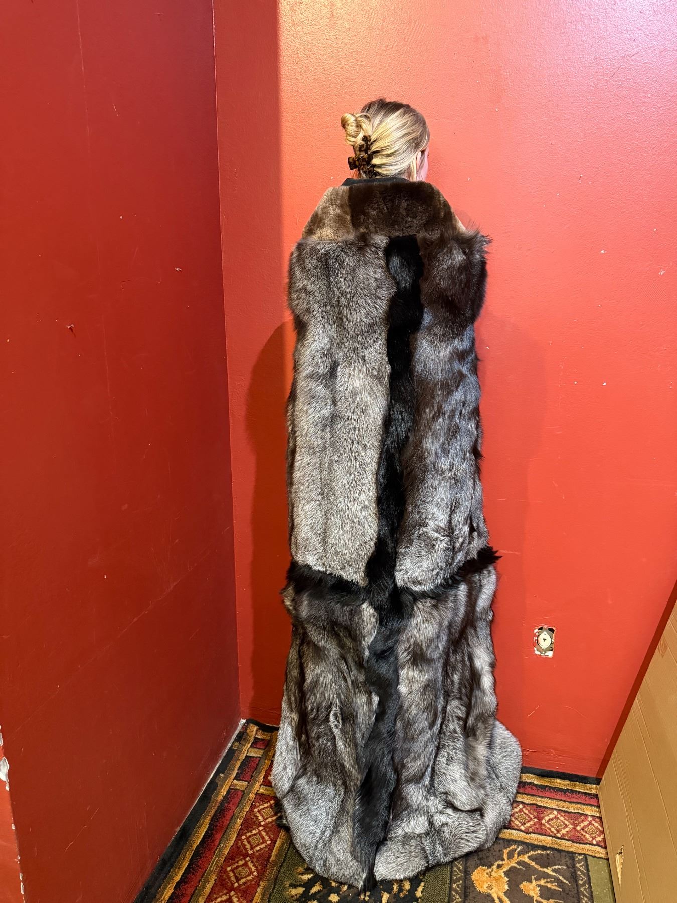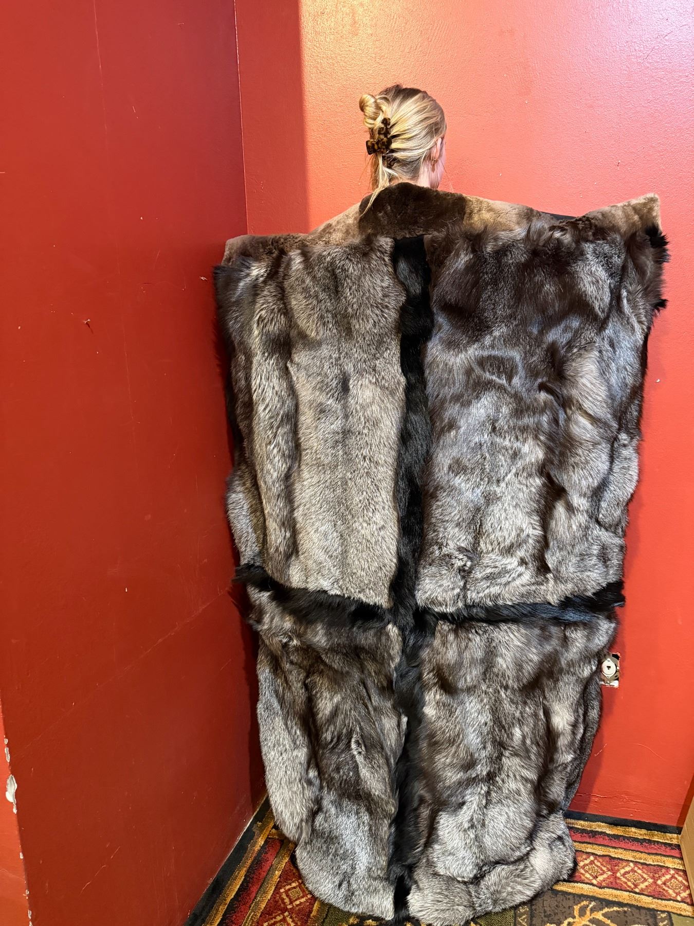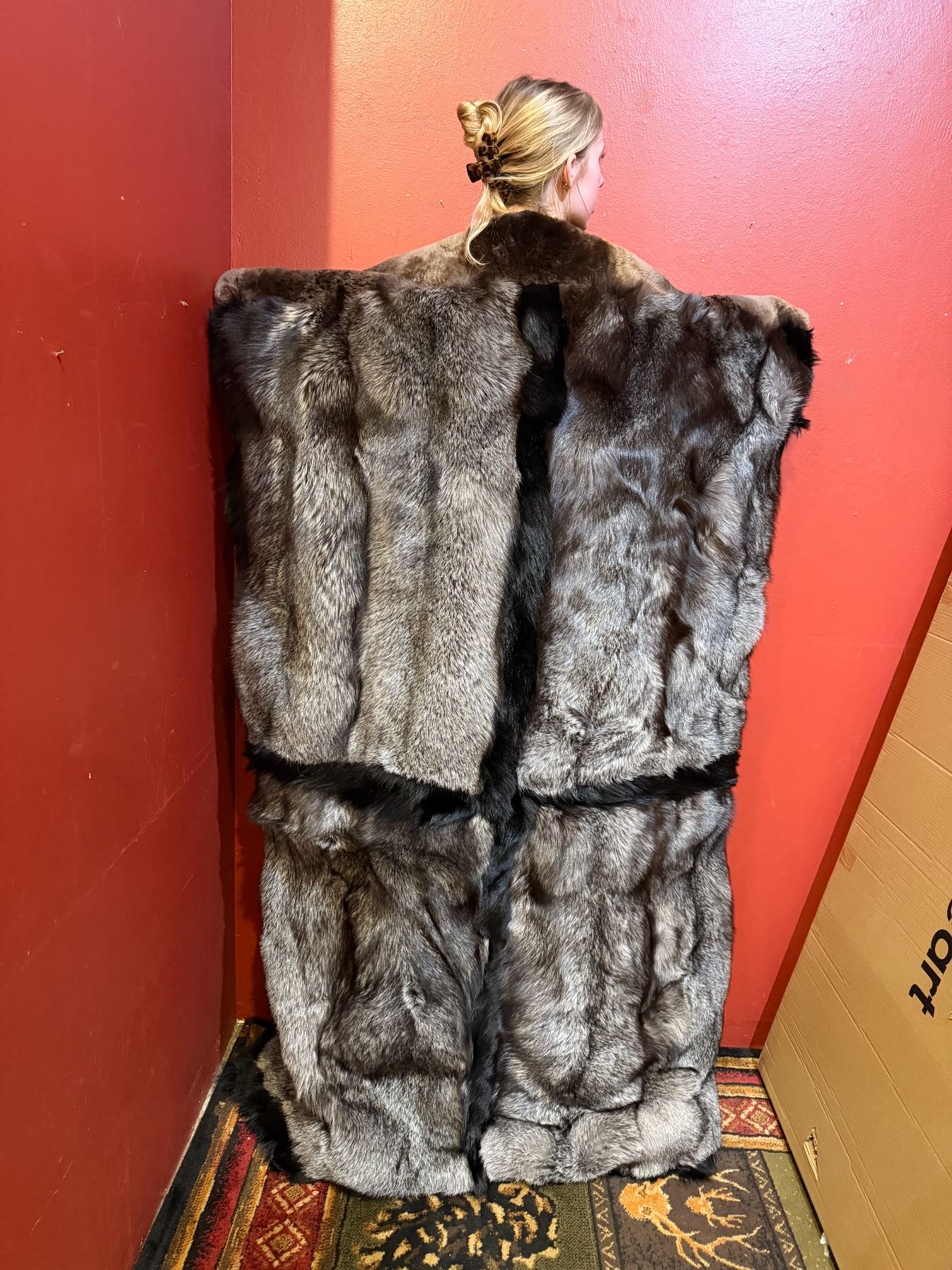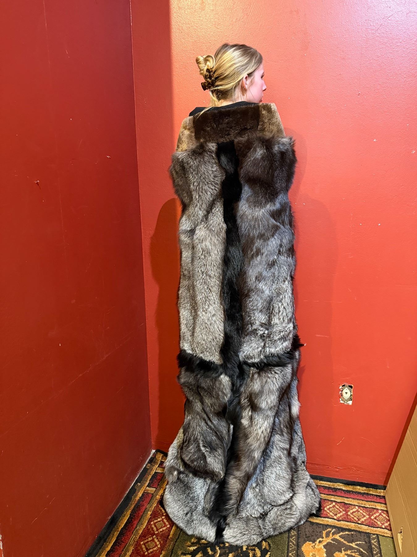 This magnificent custom blanket is dense, warm and thick and features a short soft undercoat with long glossy guard hairs that will keep the user just as warm as God intended. Produced with some of the finest quality pelts that have been so highly coveted since the Fur Trade era of the 1820's. Glamorously trimmed with prime Black Coyote accent with a plucked and sheared Beaver neck piece not only make this a utilitarian piece but would be a fantastic gift or heirloom while being the envy of family and friends alike.