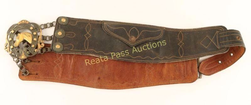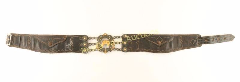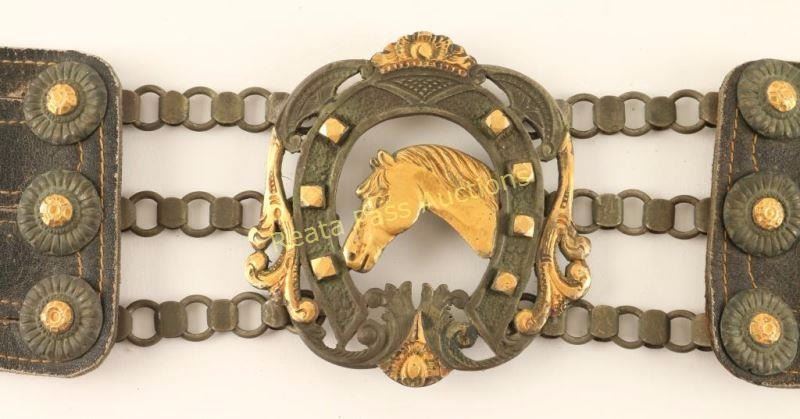 Very fancy silver centerpiece buckle with gold overlaid horse head. Stamped 'DOR' on back. Belt is black leather with a white stitch, two compartments for change, circa 1900s-1920s. Measures 39" overall.