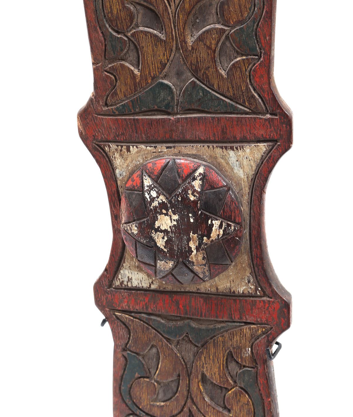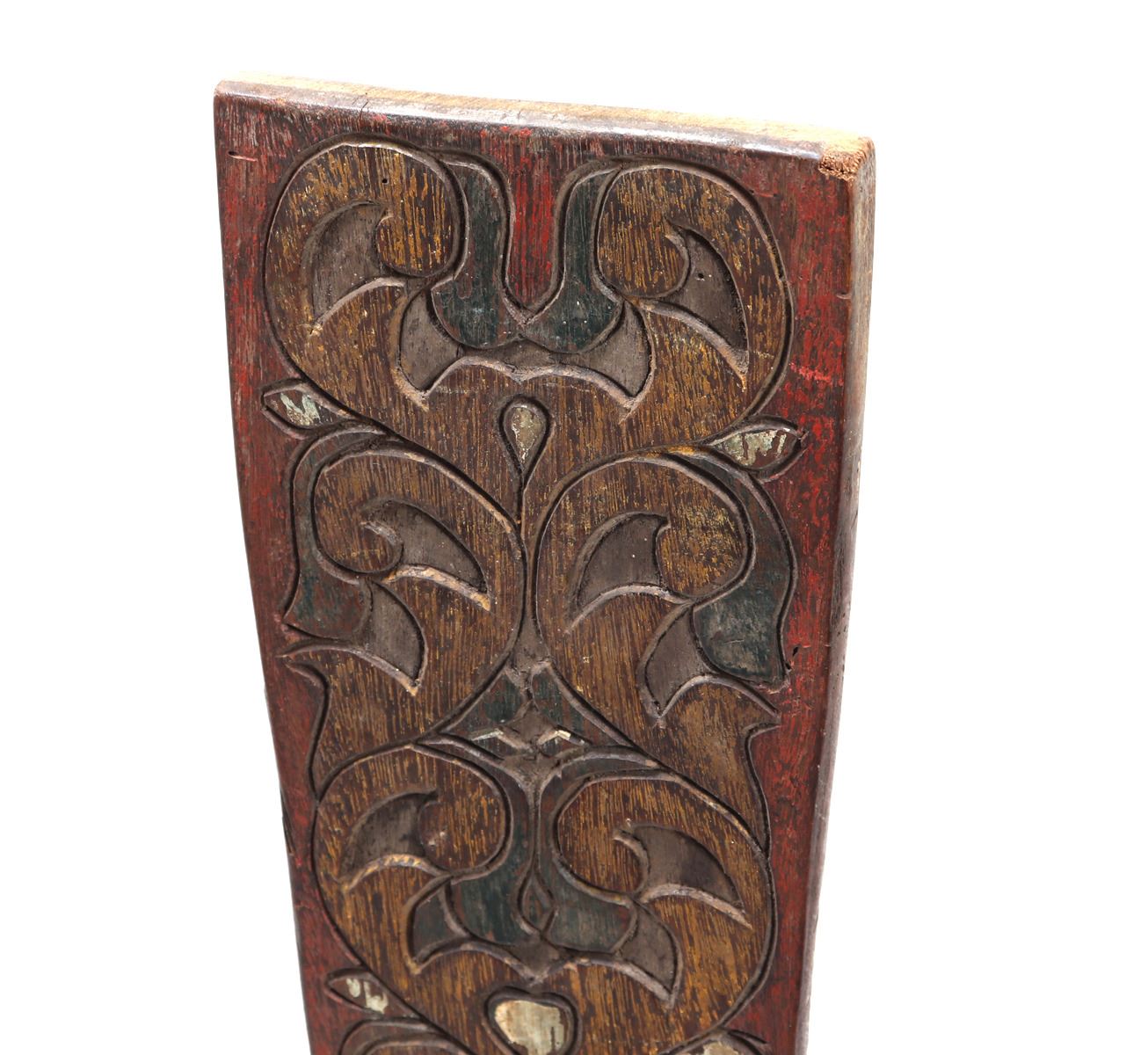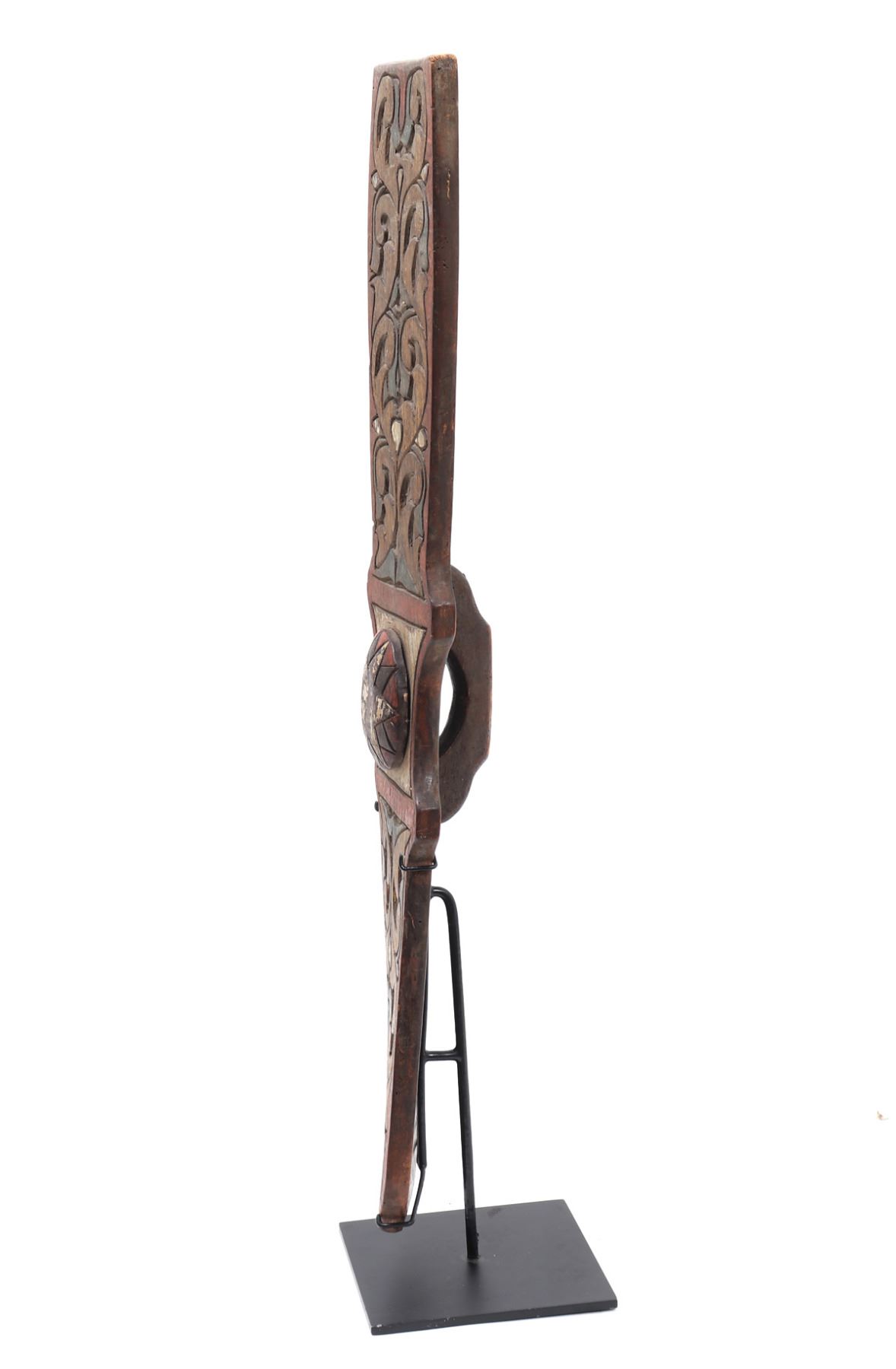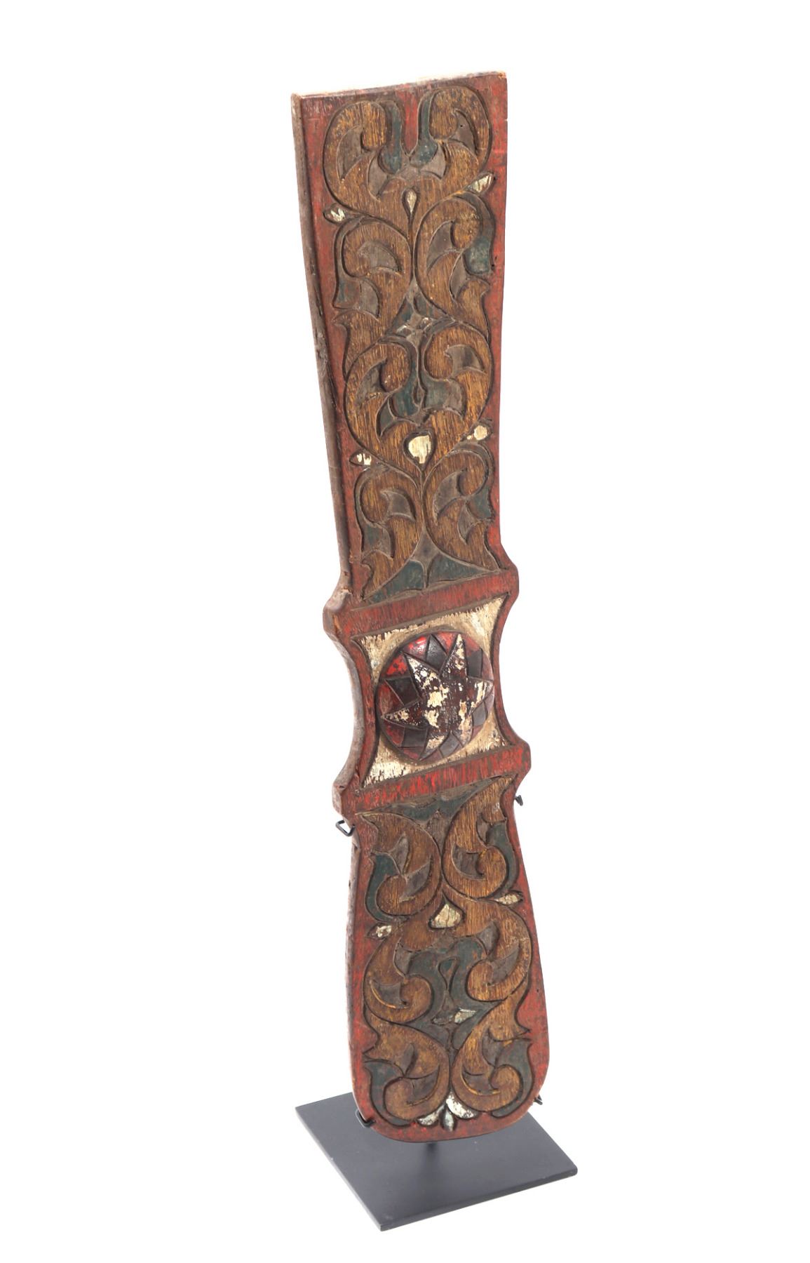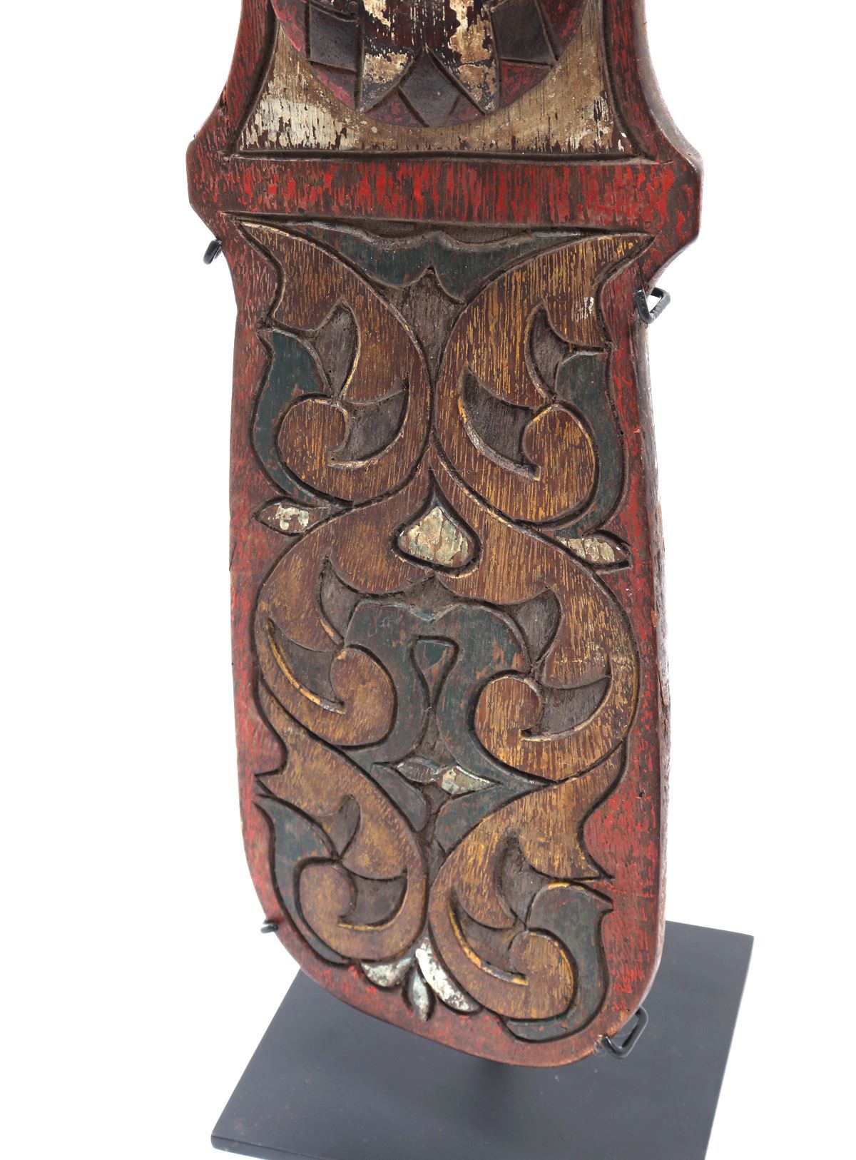 Mindanao Island, Philippines. Wonderful hand carved wood Mindanao shield decorated and painted throughout. Red, green, yellow and white pigment throughout. Leaf detail in high relief throughout. Central raised circular star center, handle to the reverse. Includes custom stand. Size 27 3/8" L x 5 1/4" W at widest point. Condition: Some losses to the pigment as shown else in well preserved condition.
