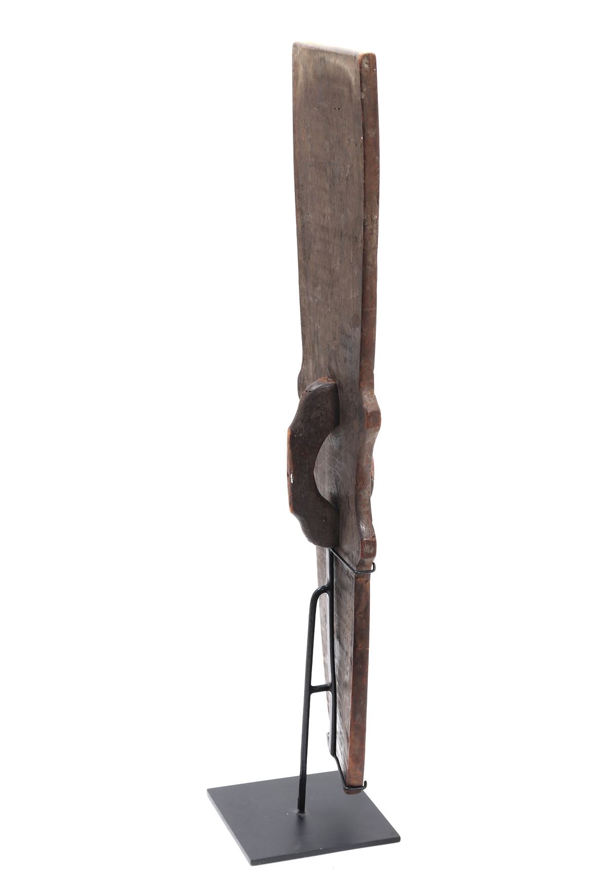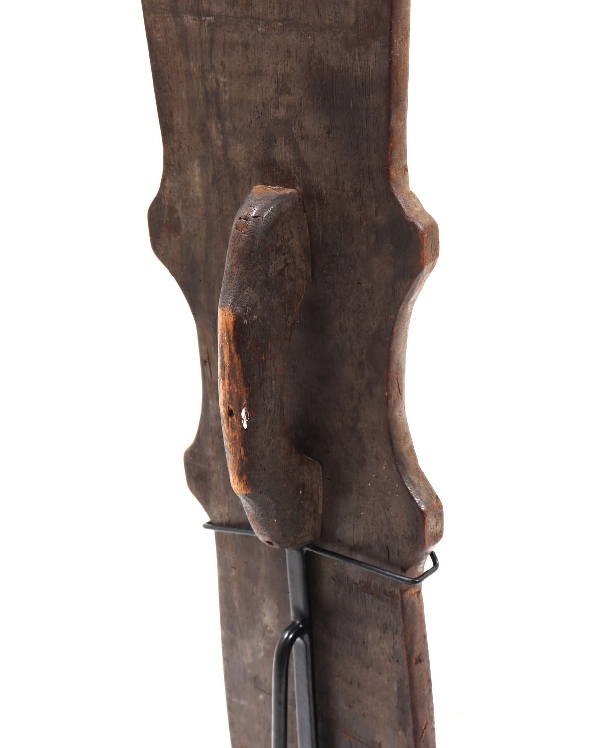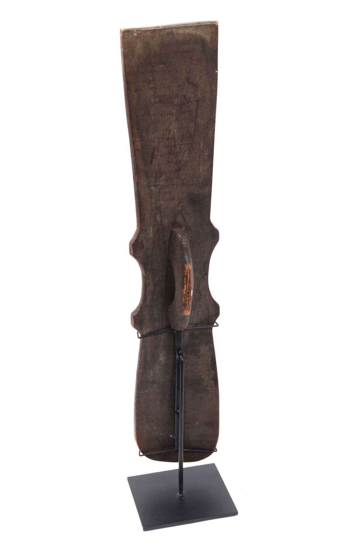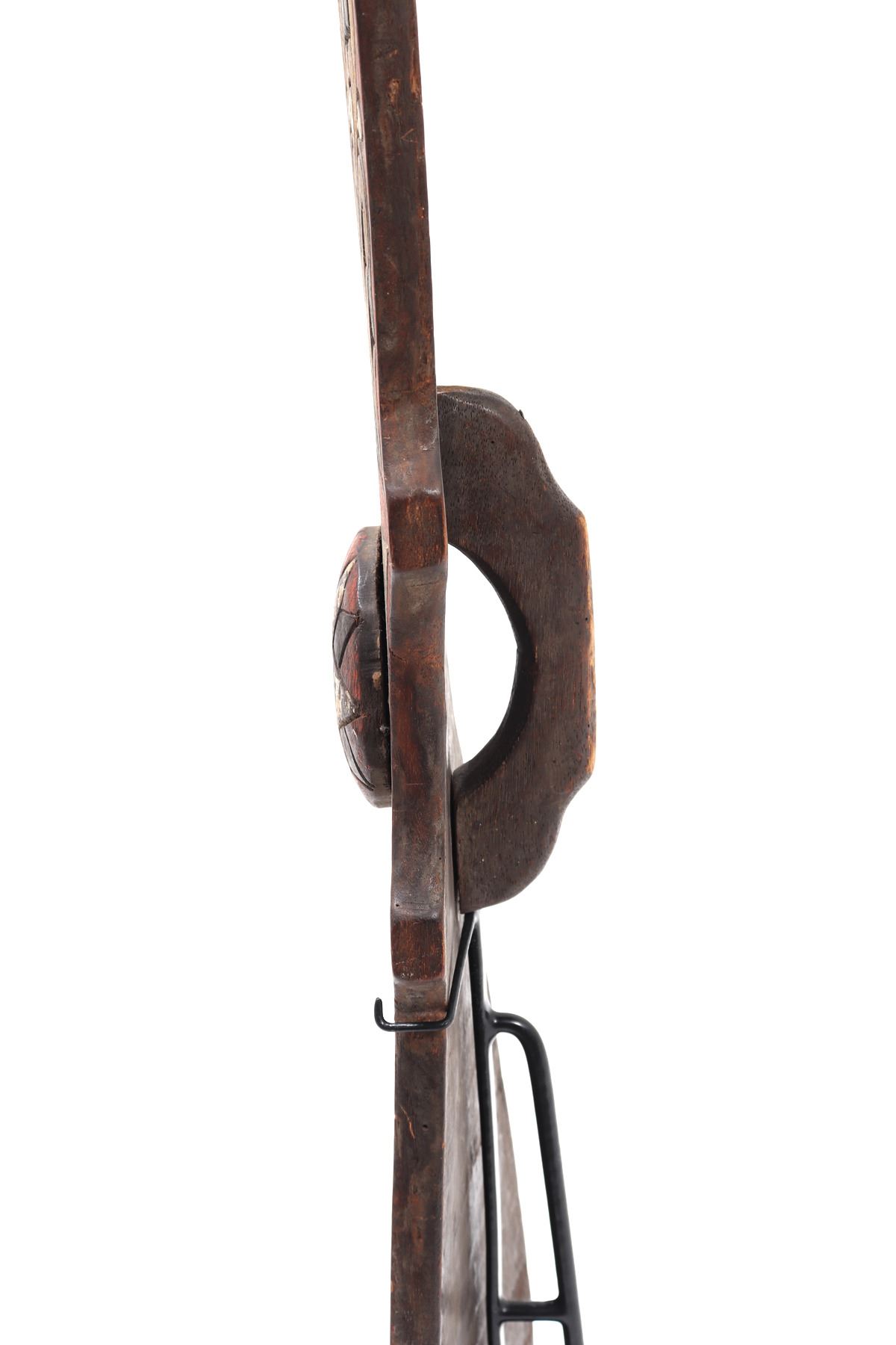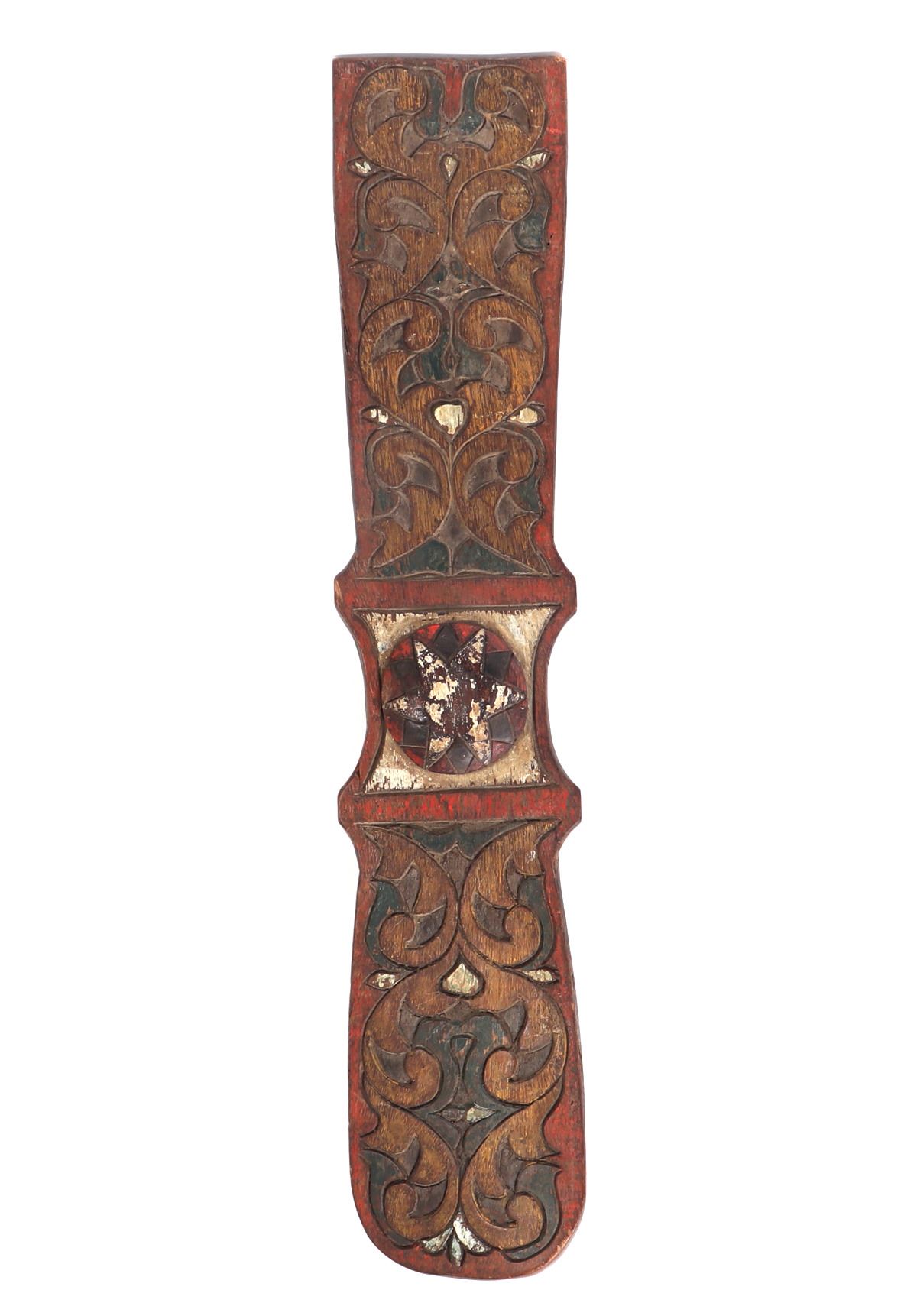 Mindanao Island, Philippines. Wonderful hand carved wood Mindanao shield decorated and painted throughout. Red, green, yellow and white pigment throughout. Leaf detail in high relief throughout. Central raised circular star center, handle to the reverse. Includes custom stand. Size 27 3/8" L x 5 1/4" W at widest point. Condition: Some losses to the pigment as shown else in well preserved condition.