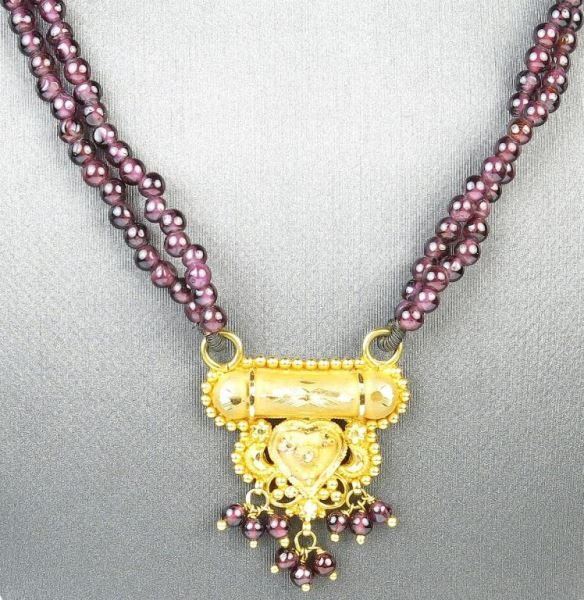 Hand crafted yellow gold and garnet necklace with purple garnet beads and 22K gold clasp.