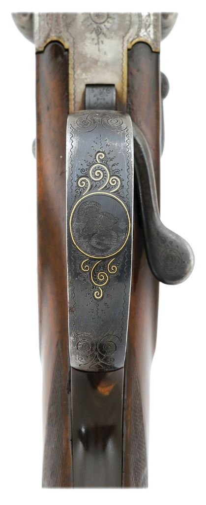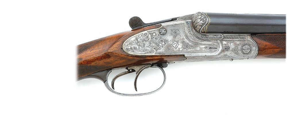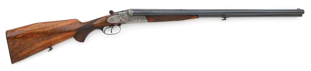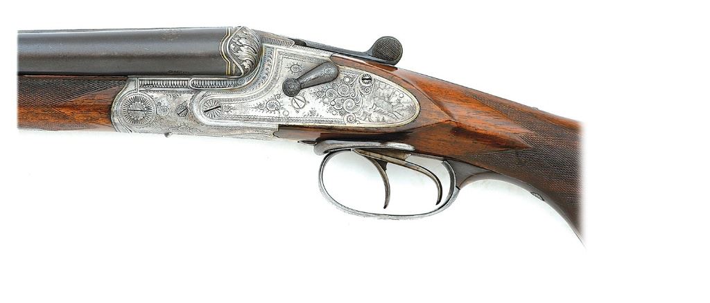 serial #7652, 16 ga (2 5/8'') over 9.3x72R, 26 3/8'' Wittener Gewehrlaufstahl barrels choked improved modified and full with bright very fine bores showing a little subtle frosting and a couple of tiny shallow dings that are just barely noticeable, the rifle bore similar with some fine frosting in the grooves and crisp rifling. This is an attractive drilling, the barrels retaining about 85% evenly thinning original blue with areas toning to a mild gray patina under bright light along with a few light handling marks and oxidation speckles. There is a bit of audible loosened solder between the ribs that is relatively minor and the solid rib is finely matted showing maker's name inlaid in gold and dual gold bands at the breeches. The action and lockplates retain generous vibrant case-hardened colors scattered throughout mixing with some areas of mild gray-brown and pleasant silvery case-hardened patina overall. The top lever retains about 95% original bright blue while the triggerguard and rifle barrel selector lever retain about 85% bright blue. The arm is finely embellished with lovely banknote filigree scrollwork and tight foliate motifs, the fences with bold acanthus leaves with punch-dot shading and top surfaces nicely matted. There are lovely game scenes surrounded by gold wire inlay featuring stag with a pair of does on the right lockplate, another pair on the left and the bow of the guard with an auerhahn. The embellishments continue along onto the nice button release spring-loaded three-cartridge trap along the toe line, the cover of which shows more gold inlay and a small game scene with a pair of woodcock in flight. The checkered capped pistolgrip walnut buttstock and forend remain in about very fine condition as lightly cleaned and refinished showing a few thin slivers missing along the forend edges, scattered light dings and moderately worn checkering. Stock features horn grip tang, pistolgrip cap and checkered buttplate, left-side cheekpiece and hogs back comb. The barrels lock-up solid on-face via dual underlugs with sideclips and hidden Greener crossbolt and the top lever resting about center. The arm features safety lever on the left lock-plate, dial cocking indicators, European sling swivels, rifle sidelever and front set trigger, silver bead front sight and automatic silver-inlaid u-notch rear rifle sight. The right lock will require some mechanical attention as the trigger does not fire though the left lock and rifle mechanism seem to function well mechanically. Length-of-pull is 15 1/4'' and weight is 7 lbs. 4 3/4 oz. A fine and classic high grade drilling from the respected Krieghoff firm. (13D11634-2) {C&R} (3000/5000)