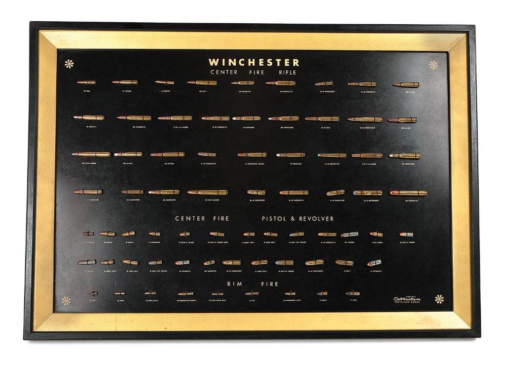 This attractive black and gold wooden framed cartridge board measures 27 7/8'' x 40'', with a view of 23 3/8'' x 35'' and contains 70 different rimfire and centerfire pistol, revolver and rifle cartridges ranging from 22 Short to 458 Winchester. The cartridges remain in excellent condition with some light tarnish and oxidation and are secured to the board with black elastic cord providing for easy removal. The frame and board remain in excellent condition as well with some minor marks and blemishes from years of hanging. The lower right corner of the board has ''Collectem / CARTRIDGE BOARD'' Trade Mark logo. The initial search did not provide much information on the Collectem Cartridge Board Co., but it is speculated that this board is a salesman's aid from the 1950's – 1960's. A handsome cartridge board for the cartridge collector or connoisseur of Winchester firearms and accessories. (5A11411-40) (700/900)