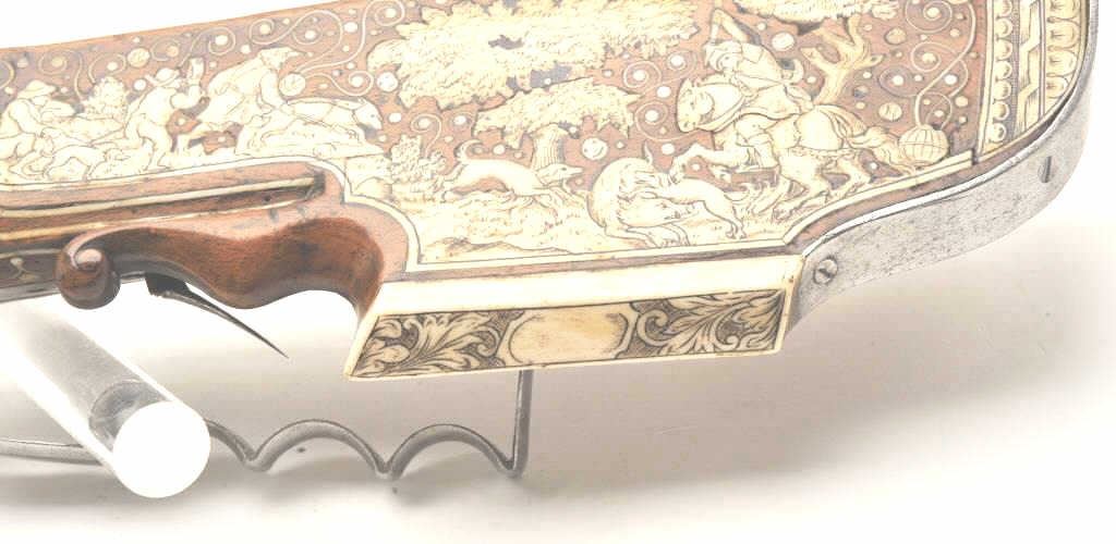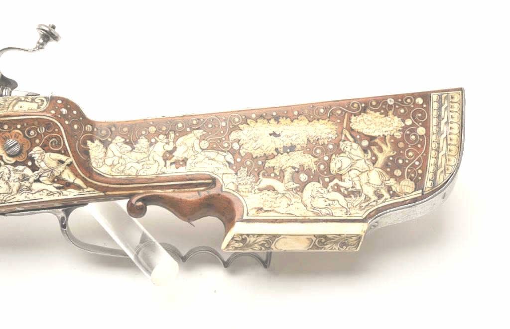 Fine original 17th century inlaid Wheelock rifle signed “Elias Schintzel A Berlin”. Measures 40 ½” overall with a 28 ½” barrel of .70 caliber smoothbore. Intricate bore inlay in game scenes with dot and scroll borders.Quality engraving and metal work. Very well-known and high grade German maker (see Shumway-Jaegar rifles). Near fine original condition with 98% plus original inlay intact. A terrific gun suitable for finestcollection or museum. Interior lock parts intact with interior period spanner. (Antique) Est.: $12,500-$25,000