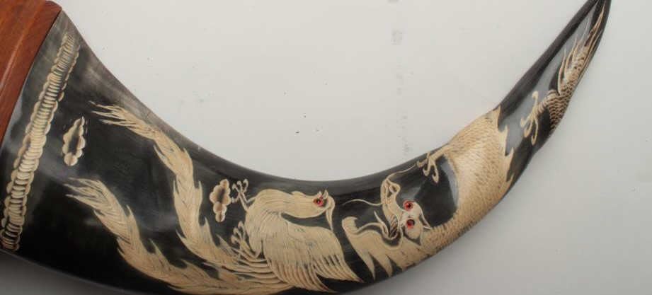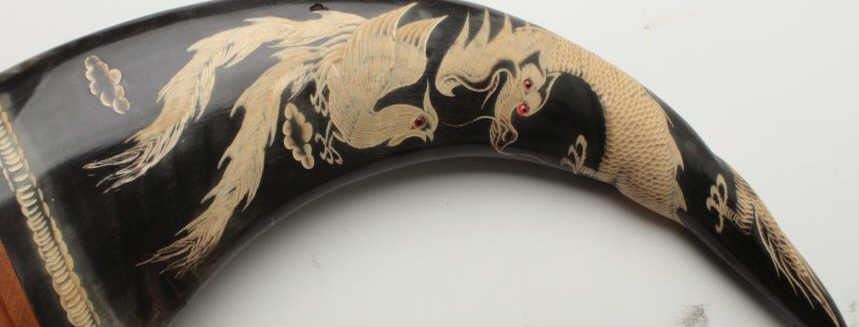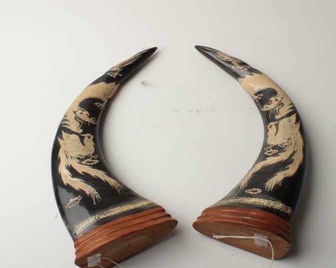 Finely carved buffalo horns from South East Asia brought home by a G.I. in Vietnam era. Est.: $100-$200
