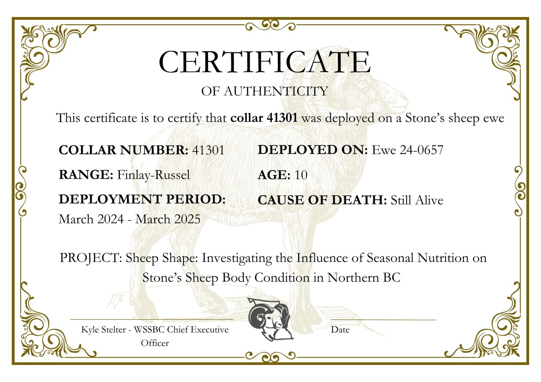 Vectronics Aerospace wildlife monitoring GPS collar 41301 was purchased by the Wild Sheep Society of British Columbia in 2022 to help monitor Stone’s sheep in the Finlay–Russell Ranges—the southernmost population of this subspecies in central British Columbia.