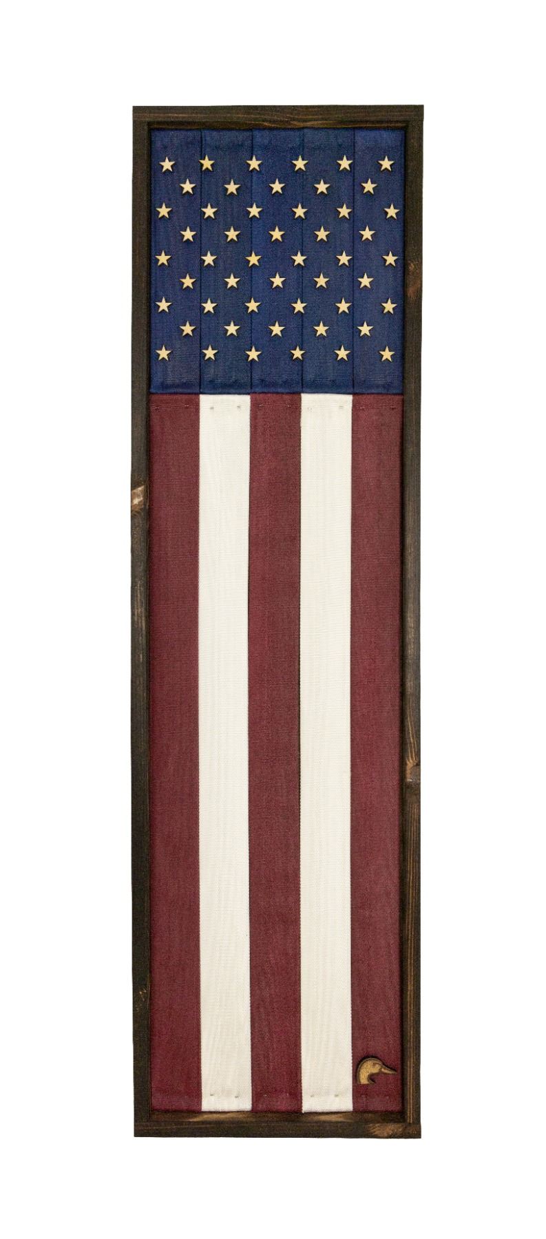 The Fire Hose Flag is a remarkable piece of craftsmanship, handcrafted from retired fire hose, giving it a unique and storied character. This flag features intricately laser-cut wooden stars and a duckhead logo, adding a touch of elegance to its rustic design. The frame is stained in a mid-tone finish, enhancing its natural beauty and durability. Measuring 48” x 13.5”, this flag makes a striking statement in any setting. Proudly made in the USA, it embodies both quality and patriotism, making it a perfect addition to any home or office.