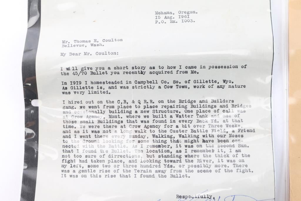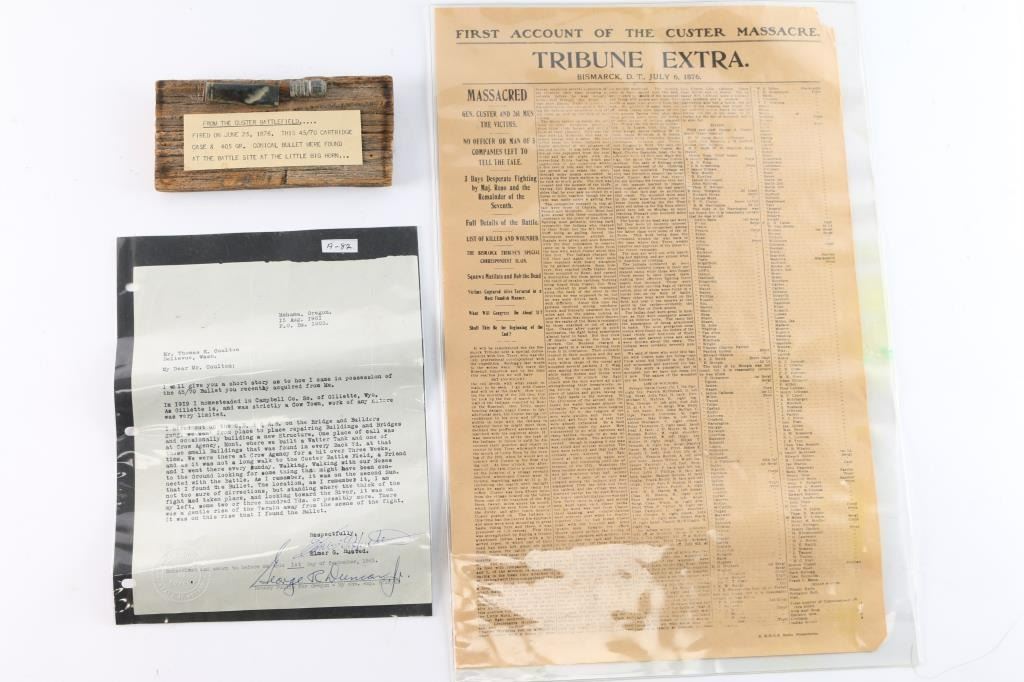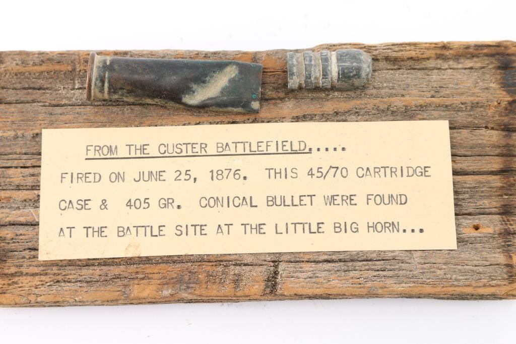 Fired .45-70 on old wood display plaque with typed label reading, "From the Custer Battlefield fired on June 25, 1876. This .45-70 cartridge case and 405gr bullet were found at the battle site at the Little Big Horn." A 1961 dated and notarized letter states the history of the bullet being found at the battle site. Along with first account of Custer massacre by Bismark S.D. Tribune July 6, 1876.