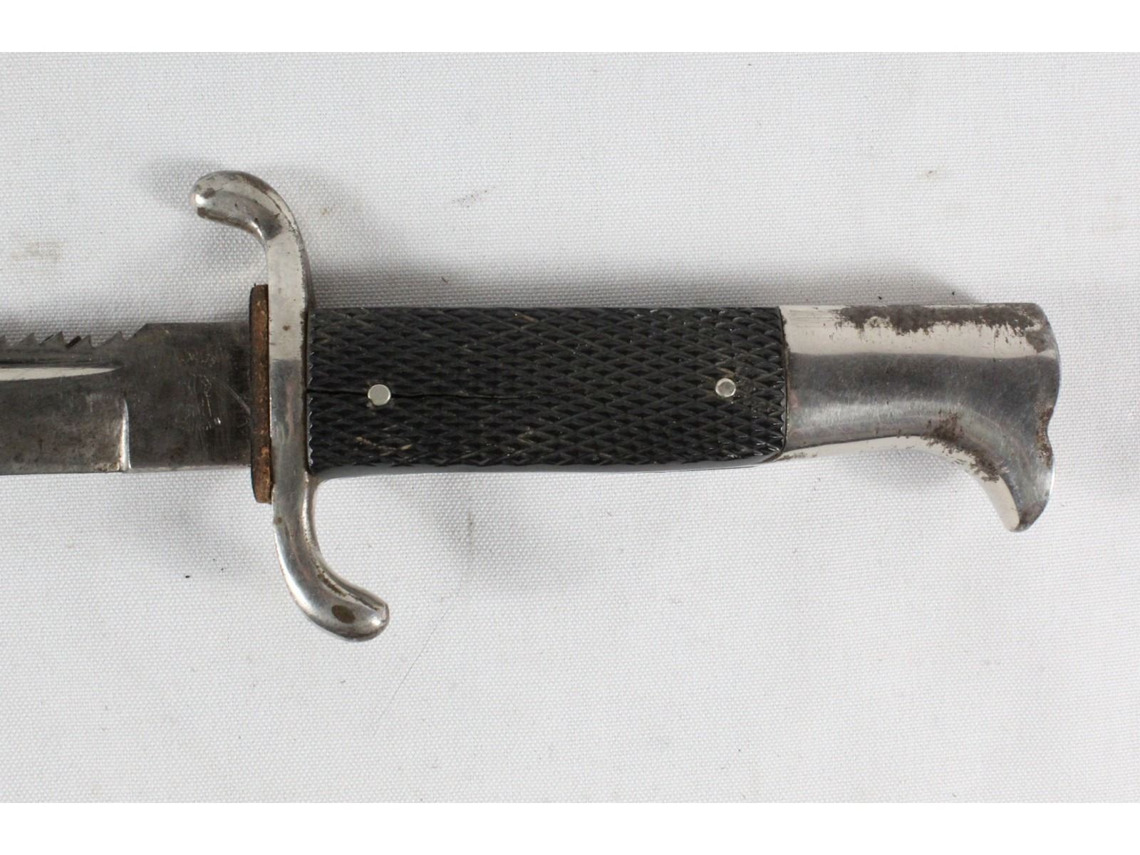 Blade measures 7.75, overall 14". Blade shows some wear but in good shape. Anton Wiggins logo on blade. Very sharp sawback. Some finish wear to bird's head pommel. Grips are complete with a crack through rivets on back side. 90% original black paint on scabbard.