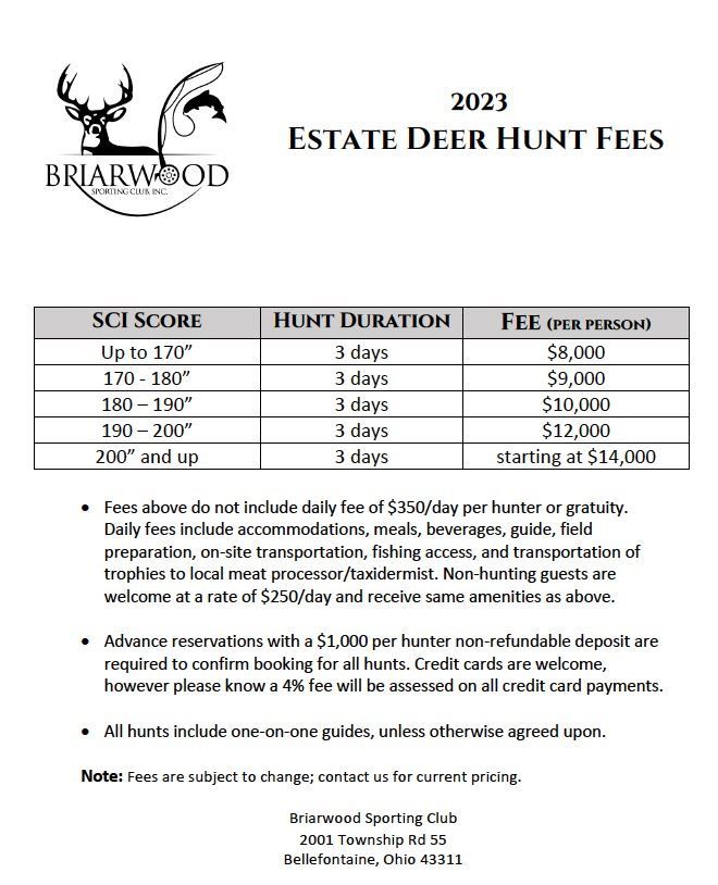 Briarwood is located 45 minutes Northwest of Columbus, Ohio. Schedule per available dates mid September to mid December in 2024, or 2025. Taxidermy/shipping of trophy not included but can be arranged.